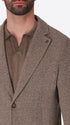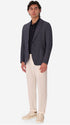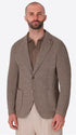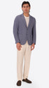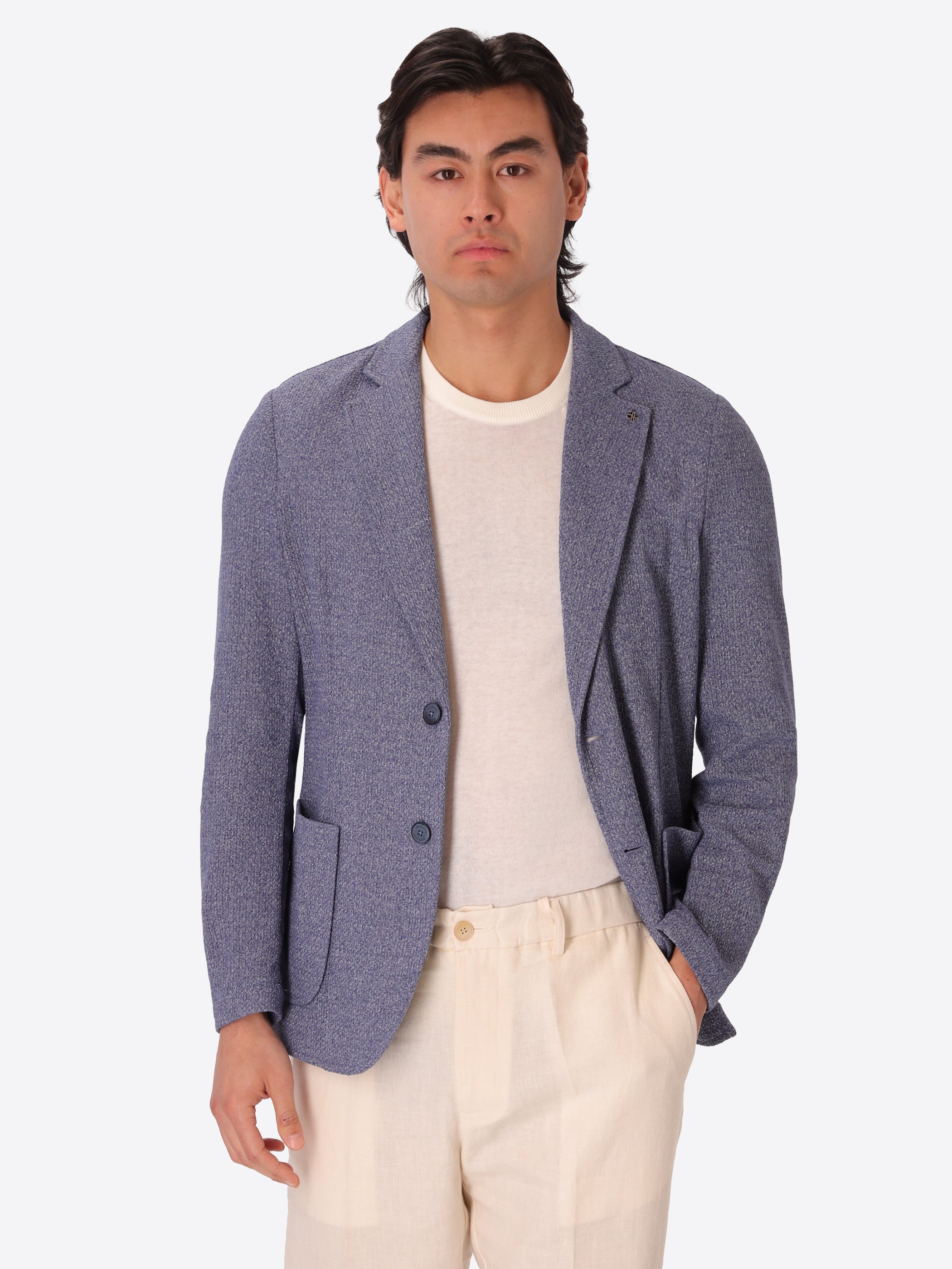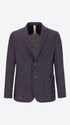 Einreihige Jacke aus meliertem Stretch-Jersey-Strickgewebe mit klarer Zwei-Knopf-Schließung und funktionaler Patch-Taschen-Konstruktion. Innen ungefüttert mit Baumwoll-Schrägband-Verarbeitung und kontrastierender Innentasche.