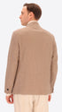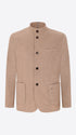 Jacke aus Wollmischflanell. Das Modell verfügt über eine mittige Knopfleiste mit Knopflöchern, zwei aufgesetzte Fronttaschen, eine Brustleistentasche und einen Stehkragen. Der Rumpf ist ungefüttert mit kontrastierenden Kanten, während die Ärmel gefüttert sind, und es gibt eine Innentasche aus technischem Punto-Milano-Jersey.