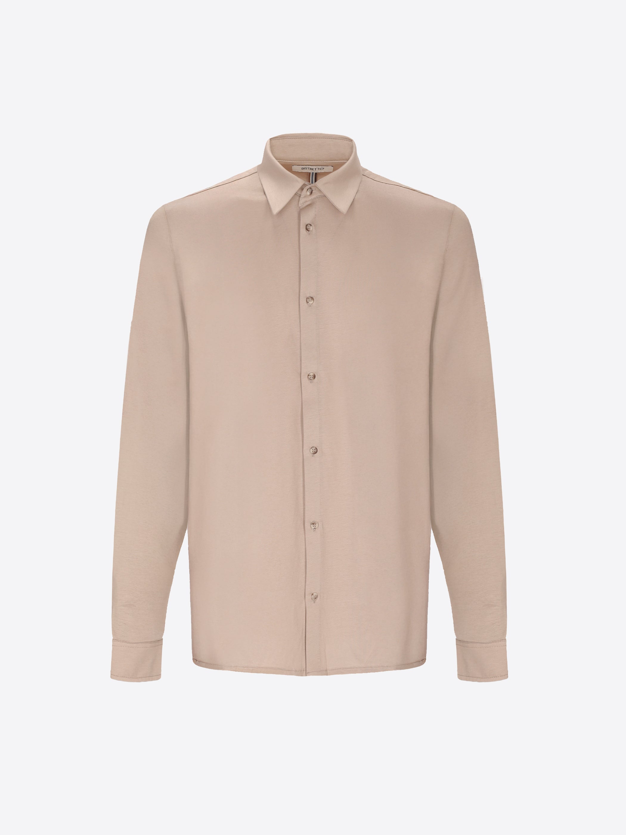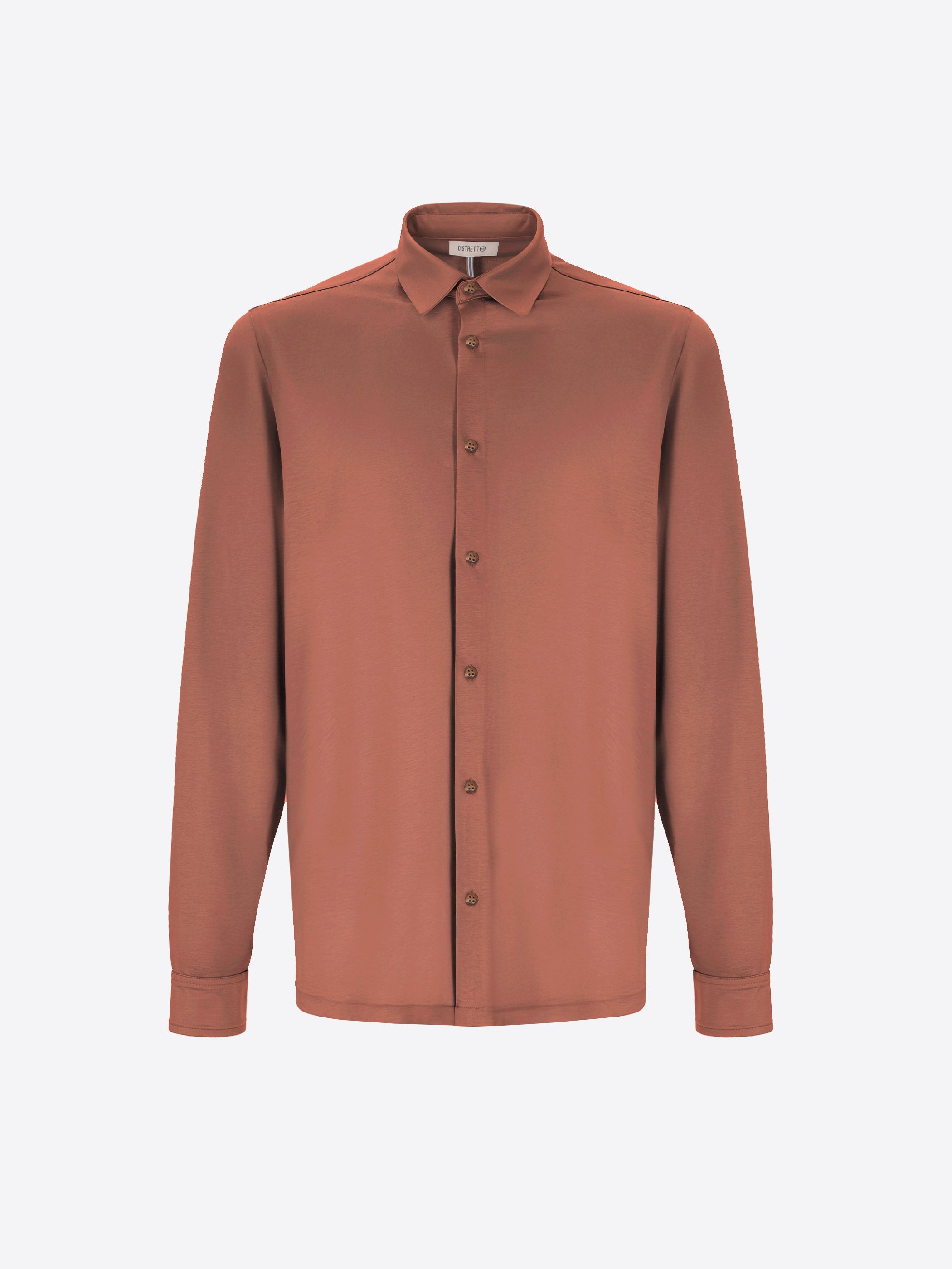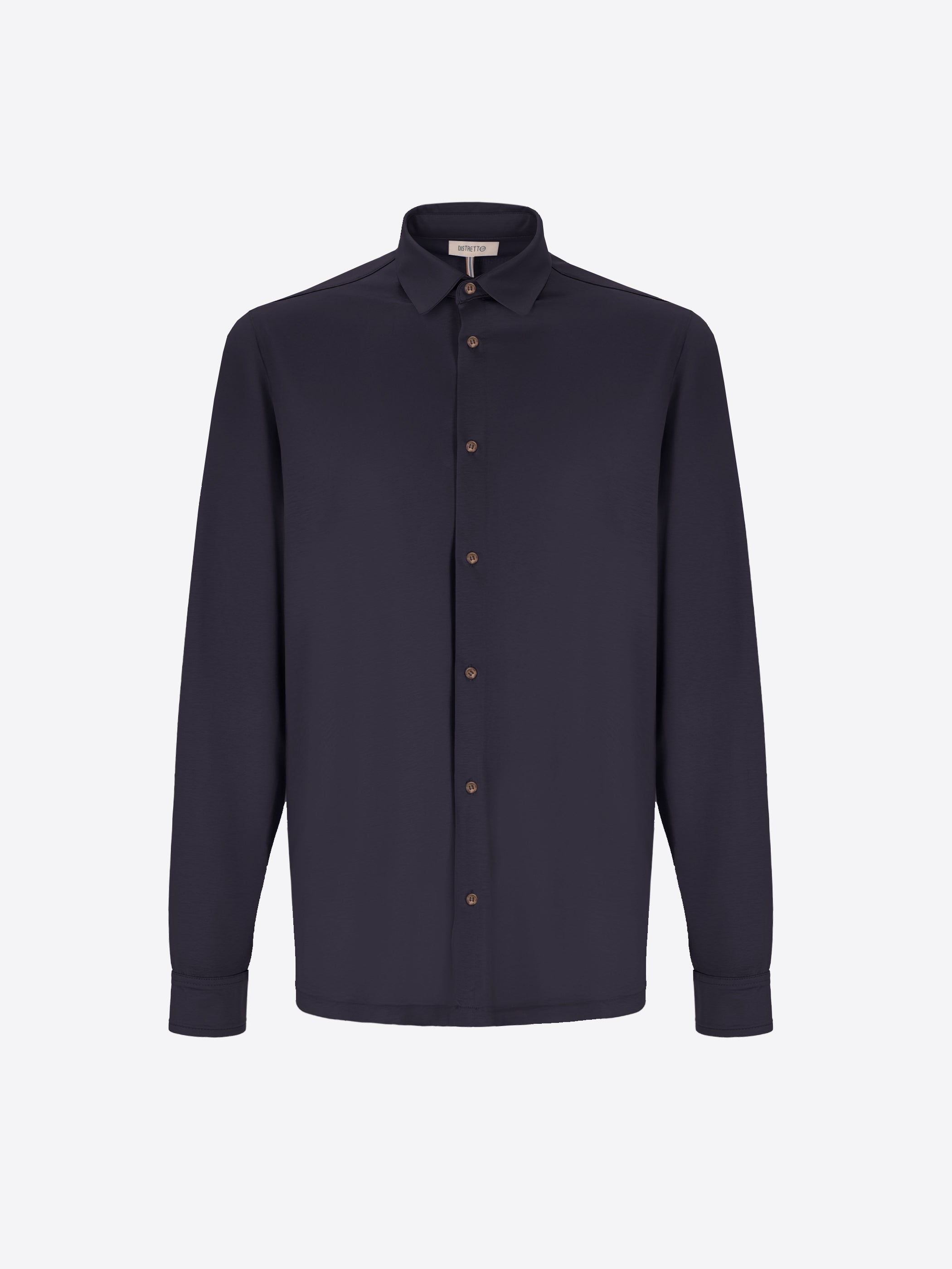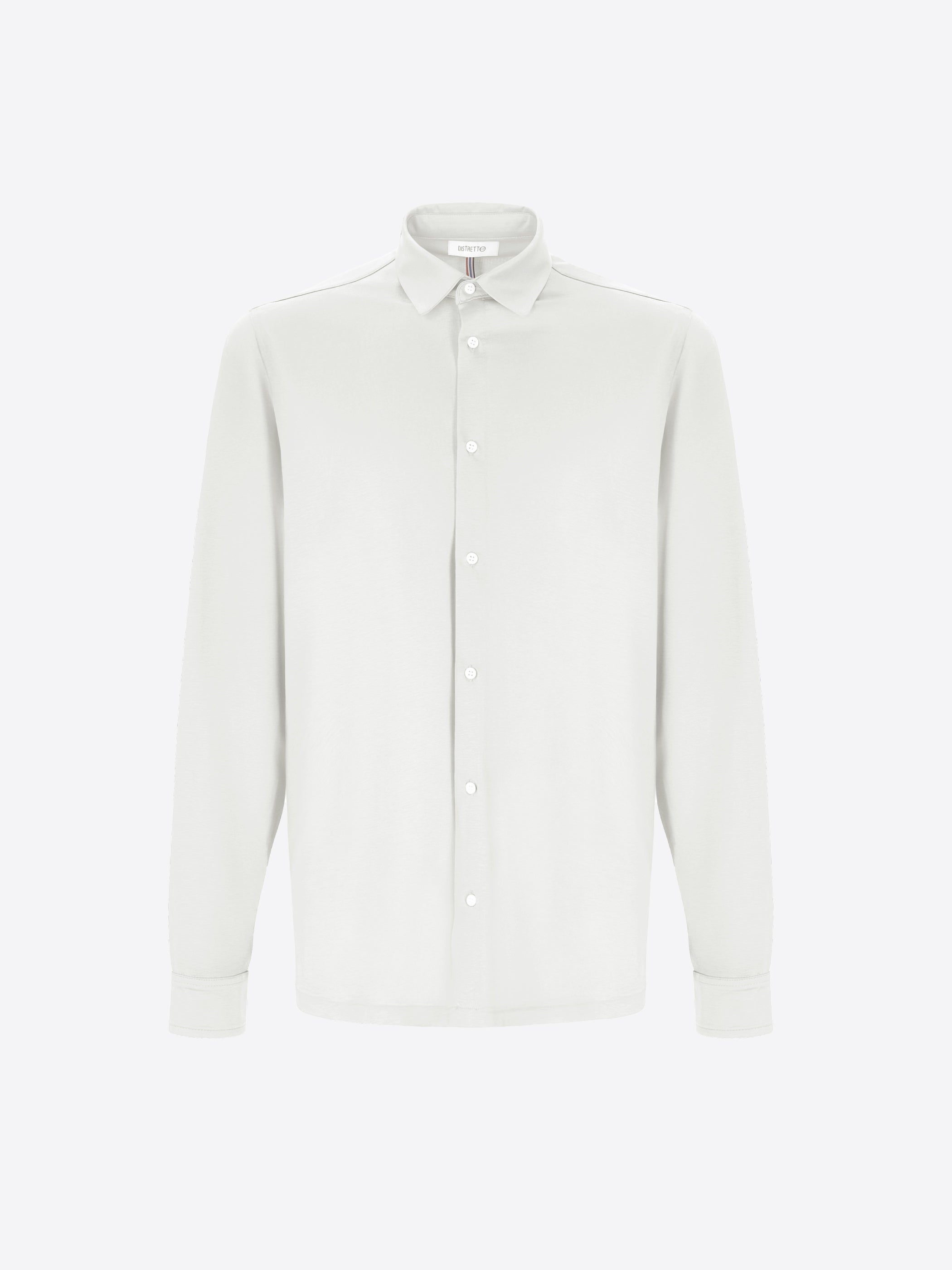 Hemd aus Baumwolle-Modal mit frischem Griff. Mit Segelkragen und zentralem Knopfverschluss. Das Rückenteil ist durch eine Passe definiert und ohne Abnäher am Körper gearbeitet.