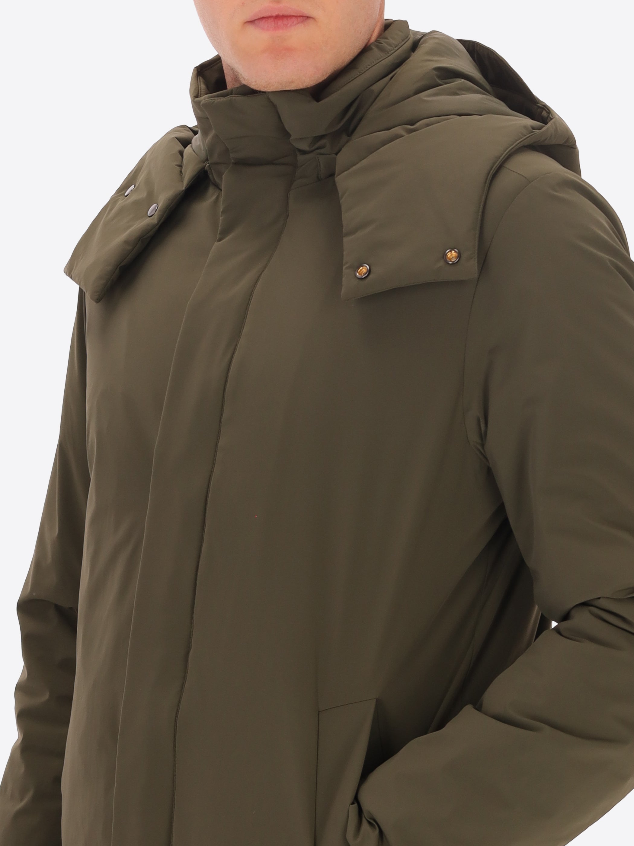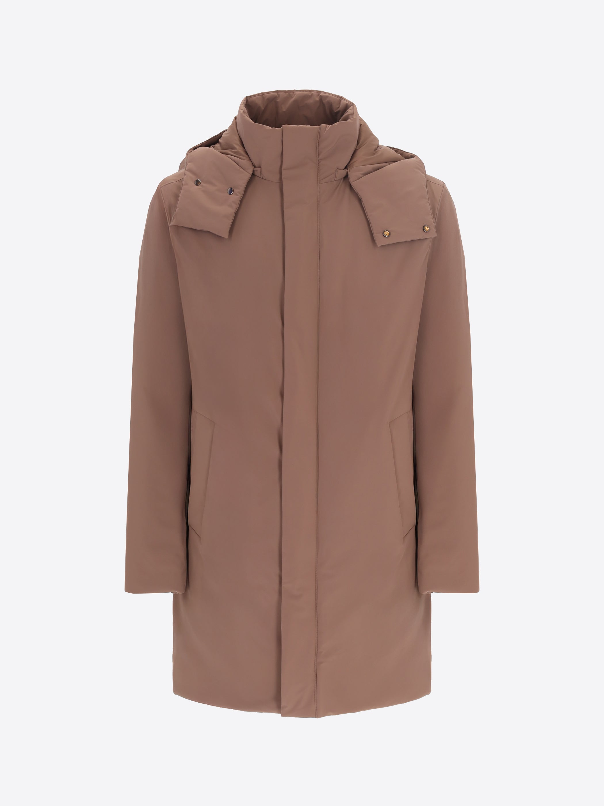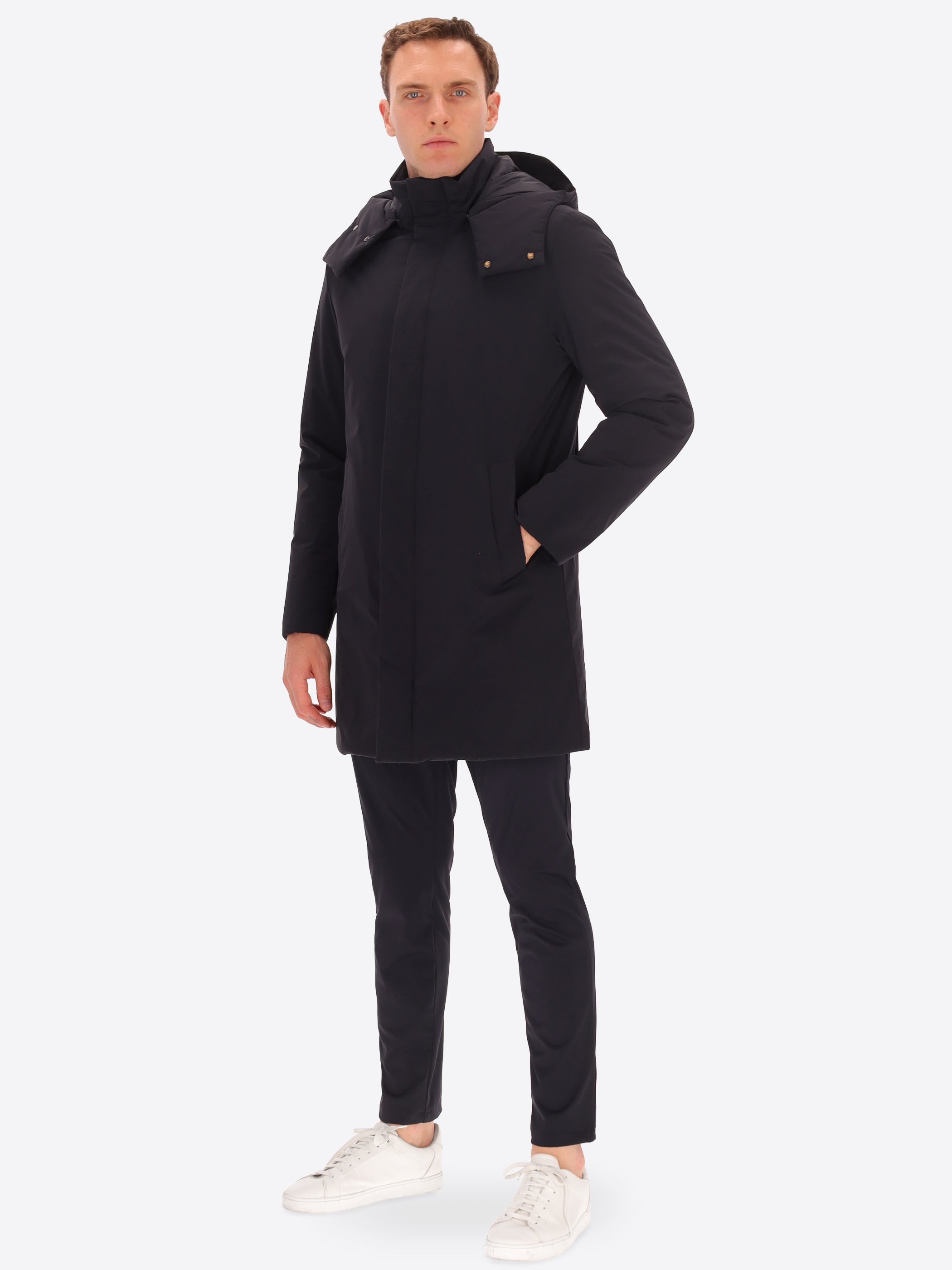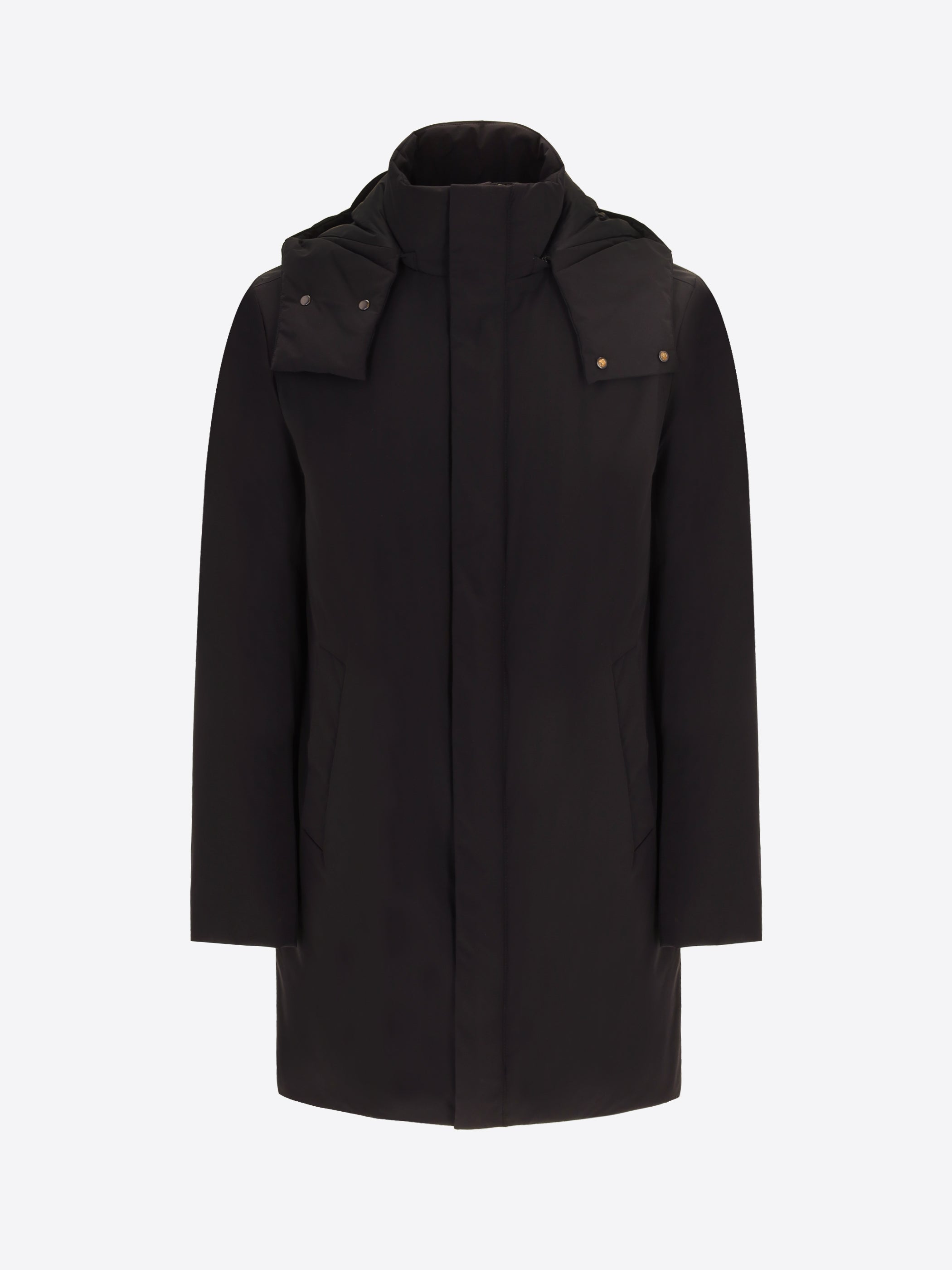 Glatter Steppmantel aus Stretch-Nylon mit abnehmbarer Kapuze. Lange Ärmel, Frontverschluss mit Reißverschluss und Druckknöpfen, Leistentaschen und reguläre Passform für hohen Komfort an kalten Tagen.