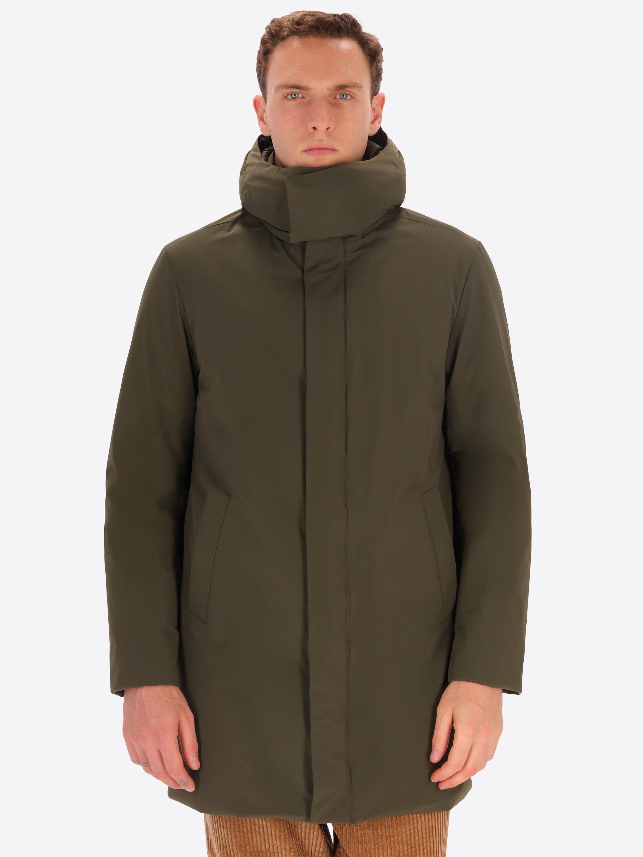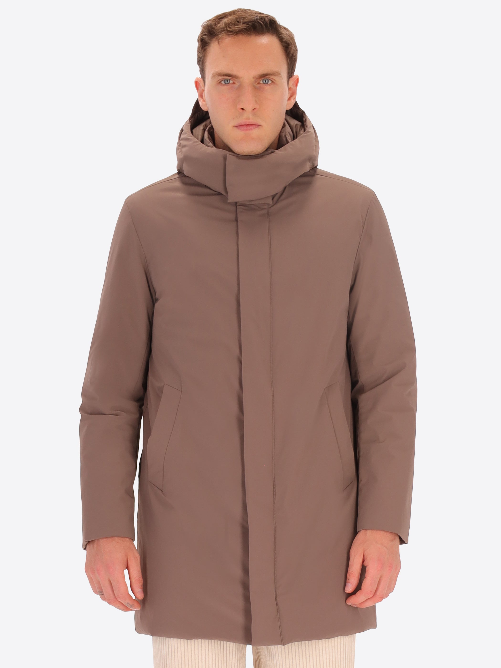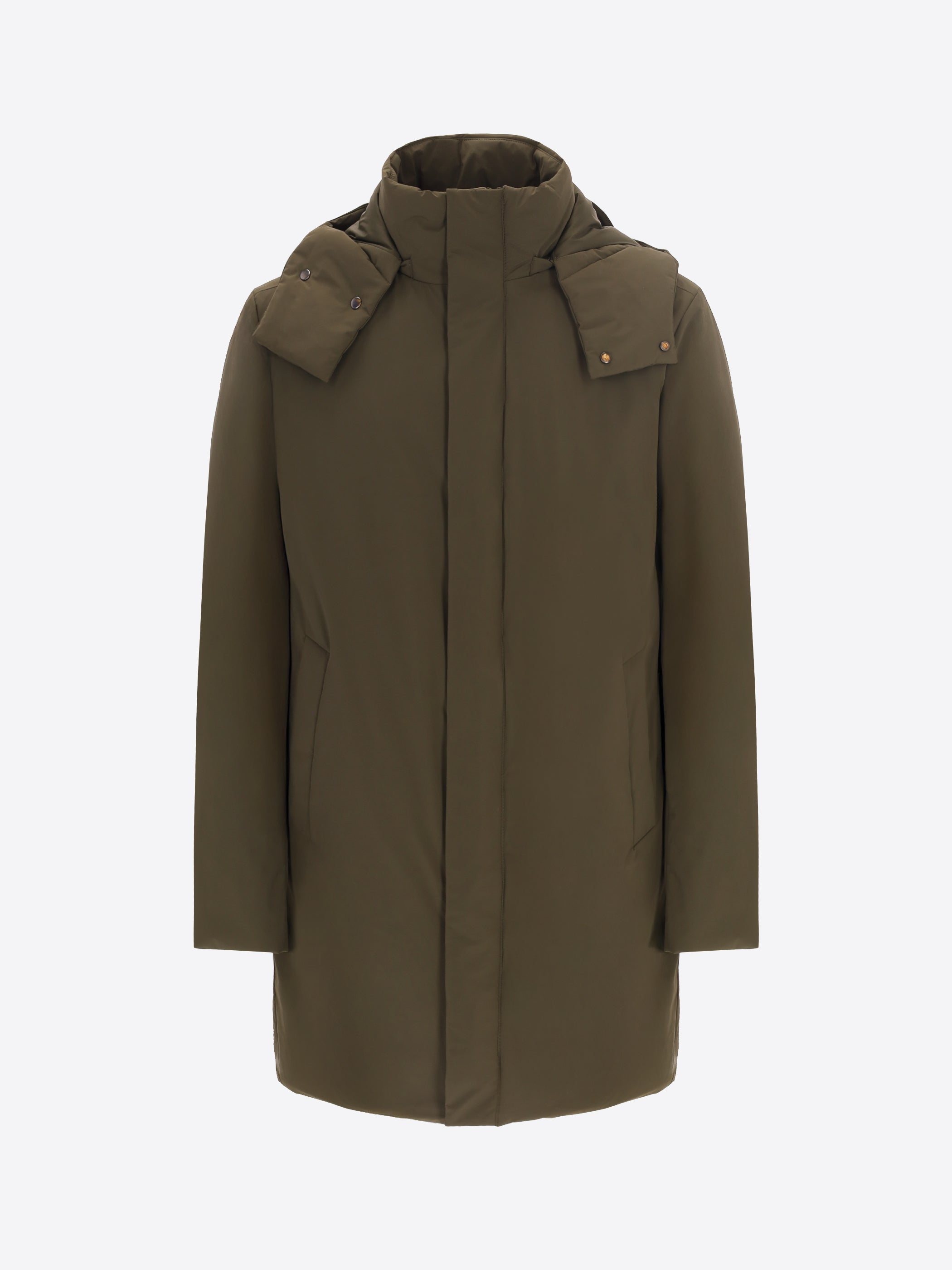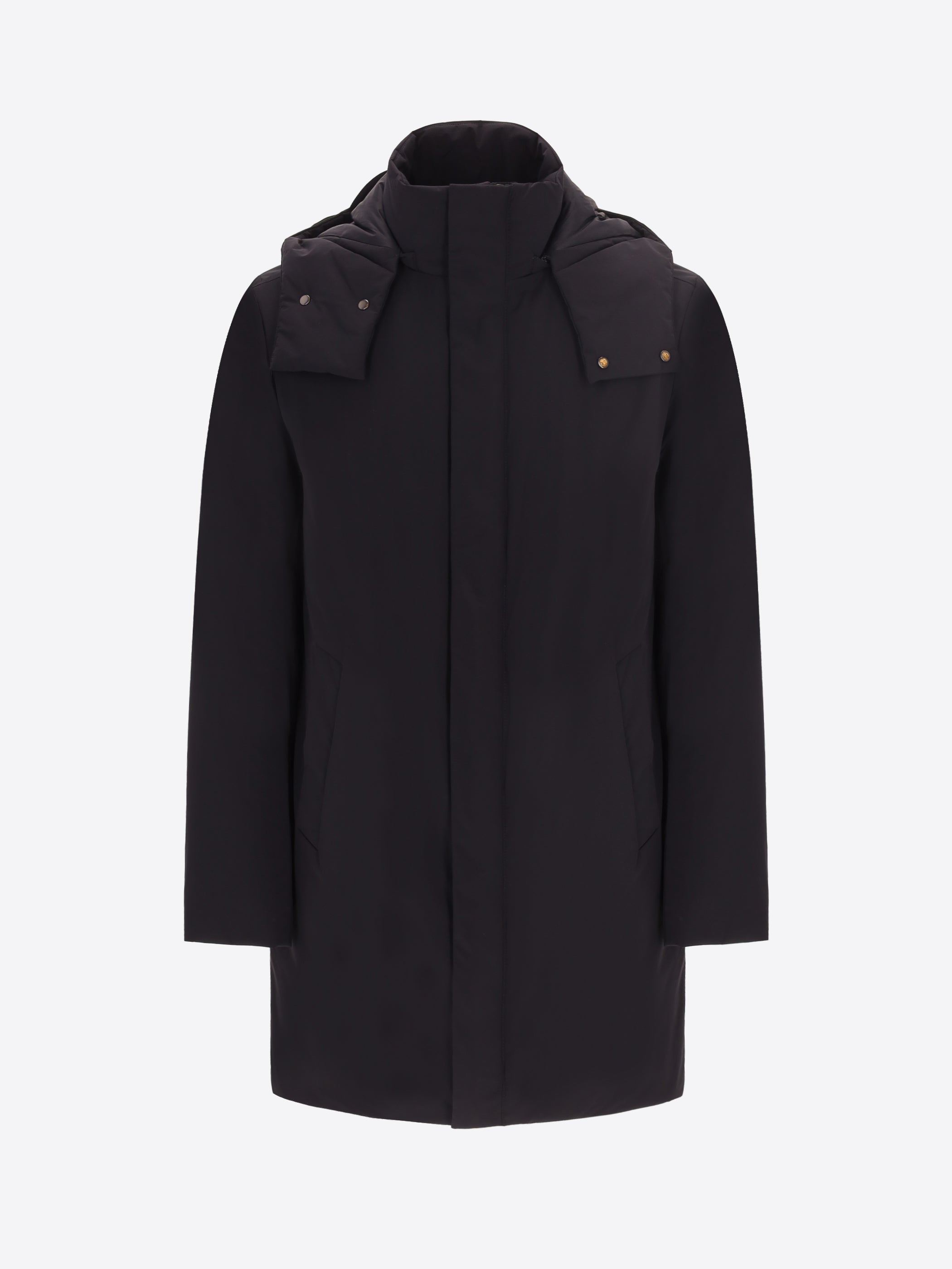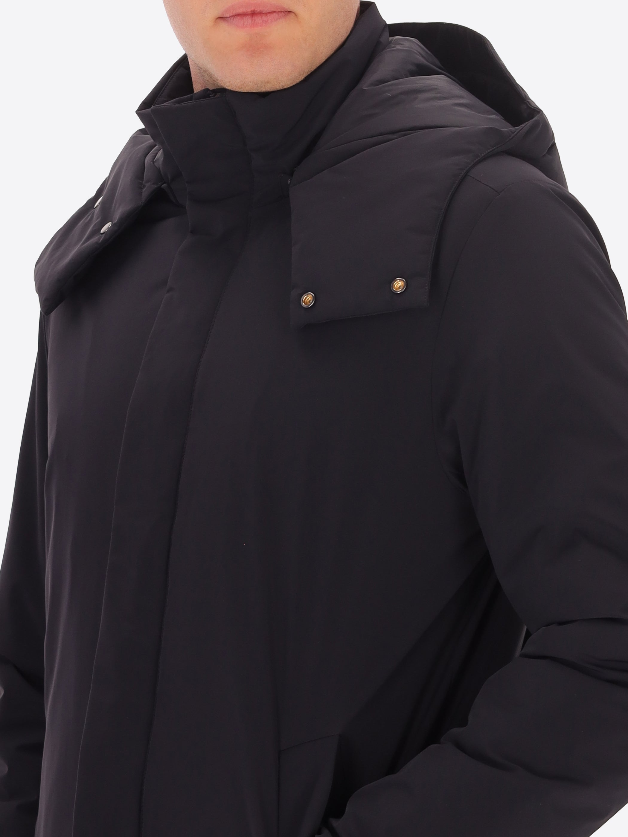 Glatter Steppmantel aus Stretch-Nylon mit abnehmbarer Kapuze. Lange Ärmel, Frontverschluss mit Reißverschluss und Druckknöpfen, Leistentaschen und reguläre Passform für hohen Komfort an kalten Tagen.