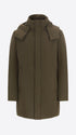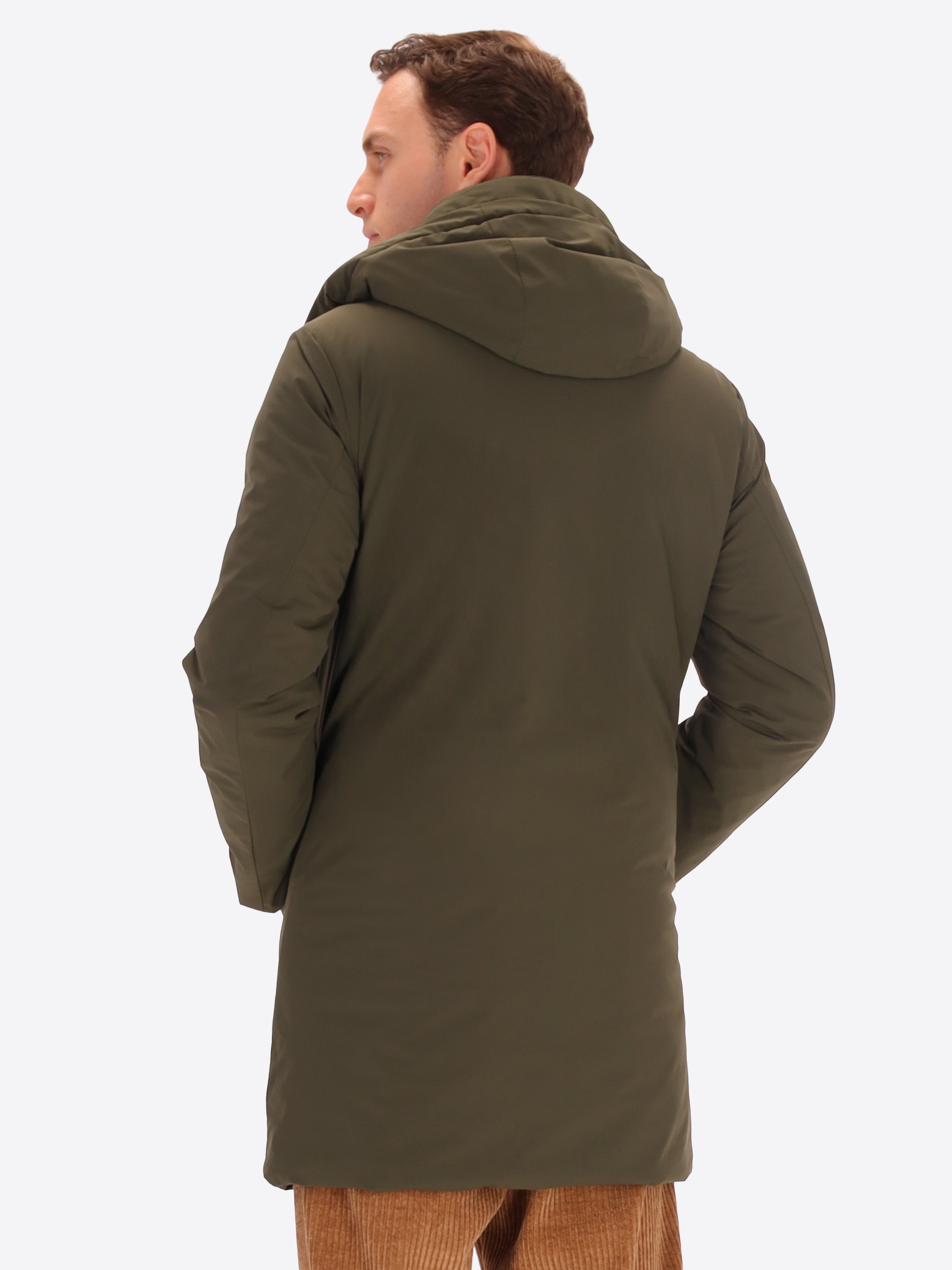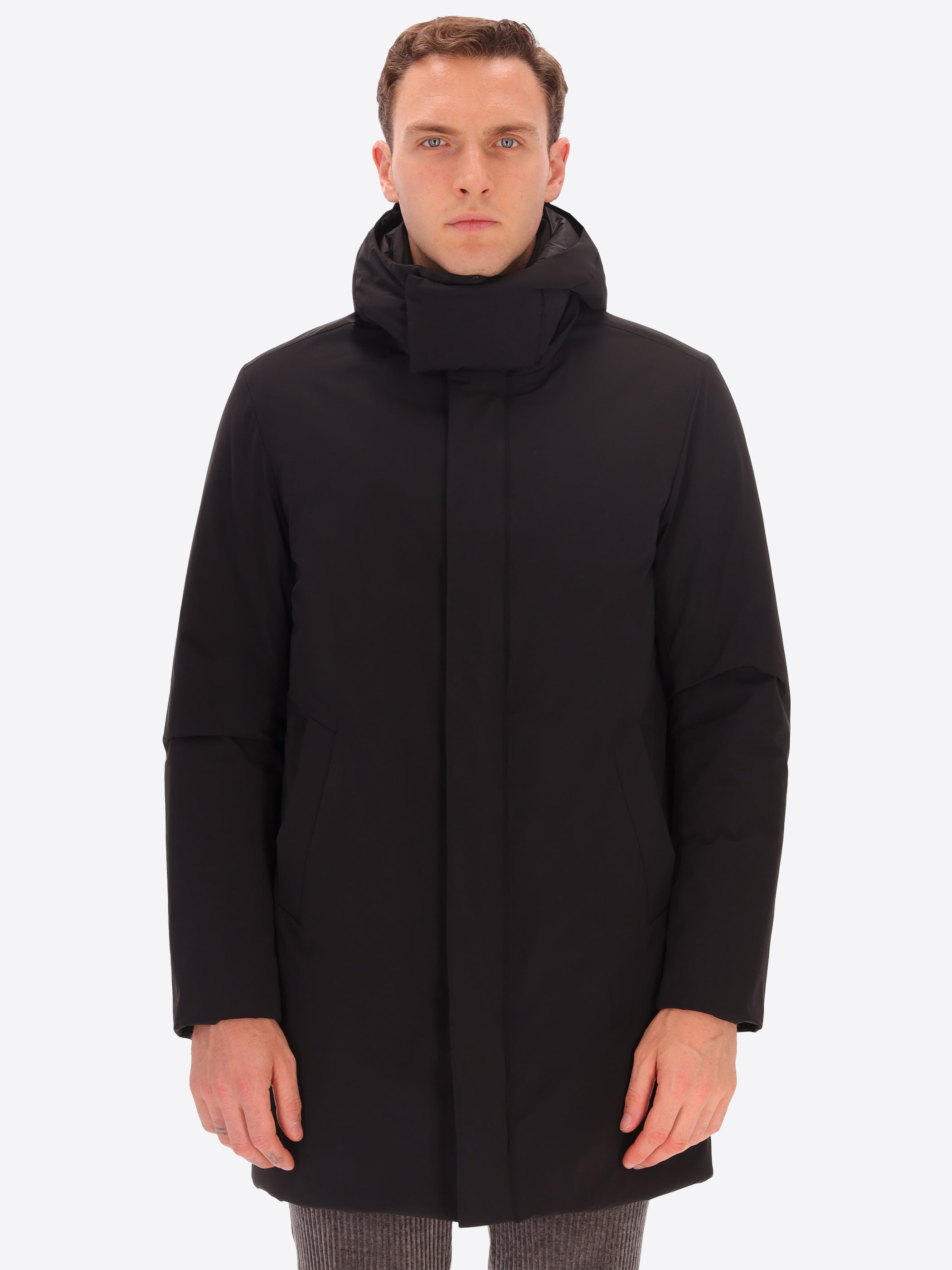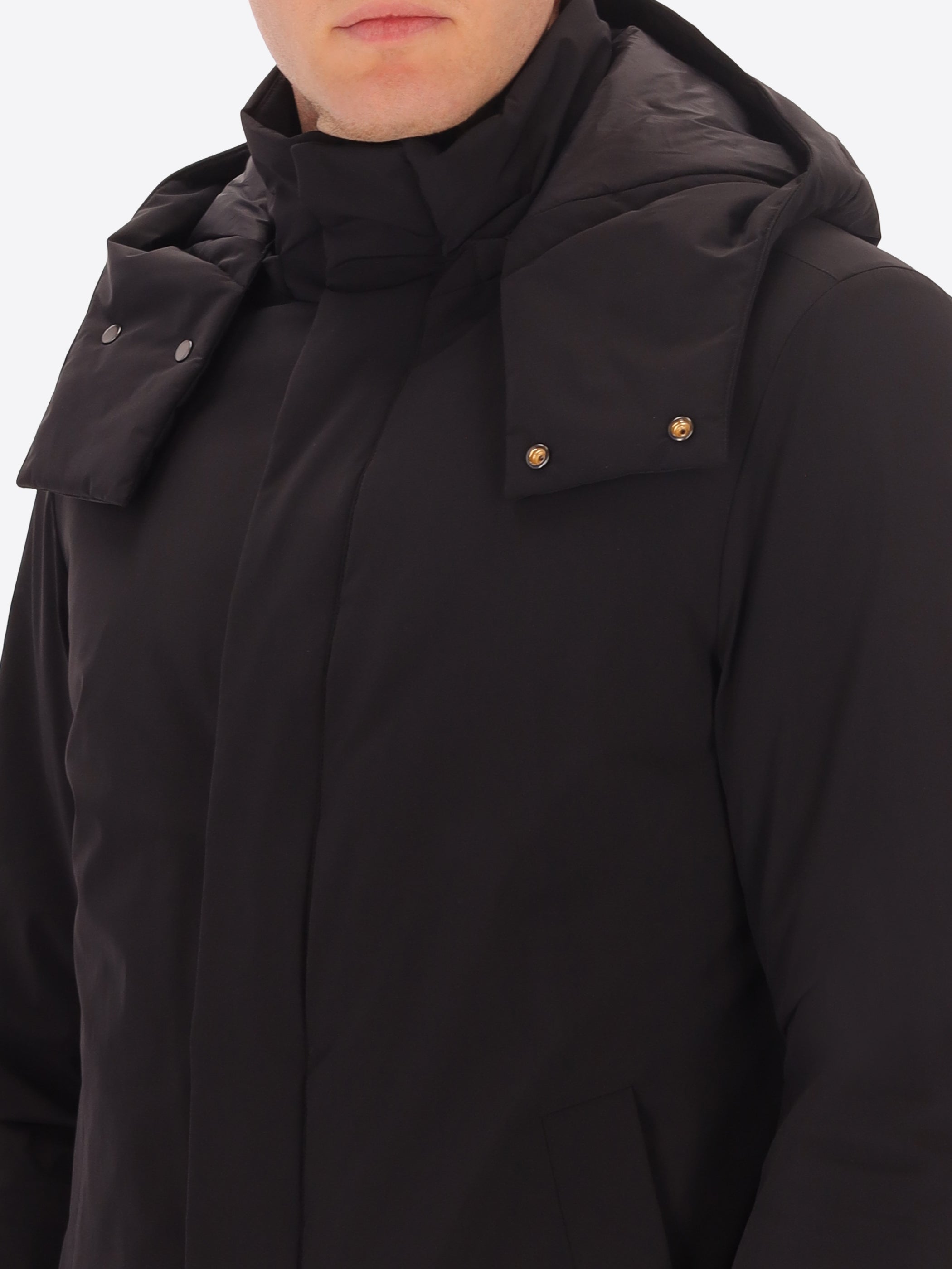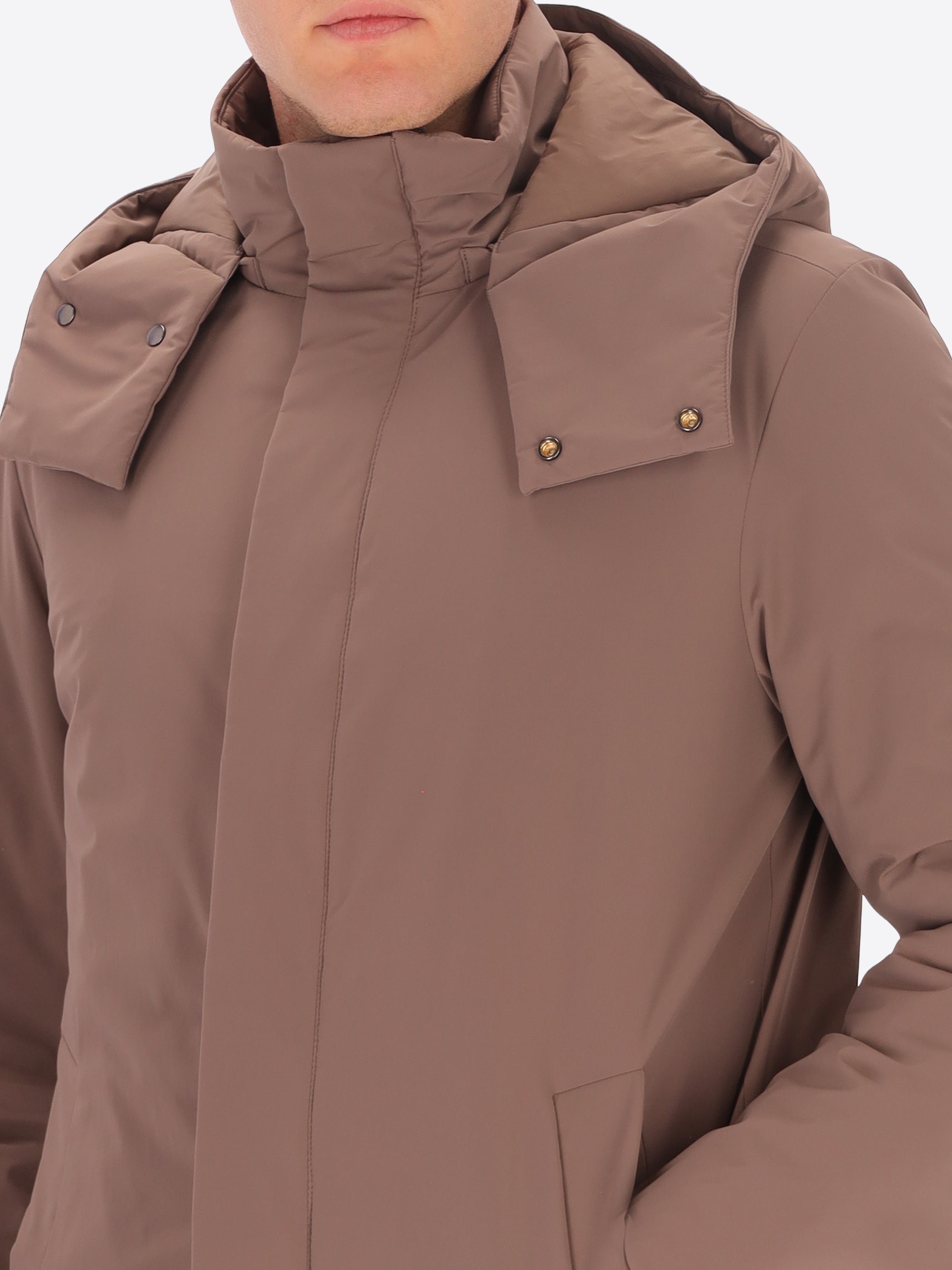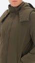 Glatter Steppmantel aus Stretch-Nylon mit abnehmbarer Kapuze. Lange Ärmel, Frontverschluss mit Reißverschluss und Druckknöpfen, Leistentaschen und reguläre Passform für hohen Komfort an kalten Tagen.