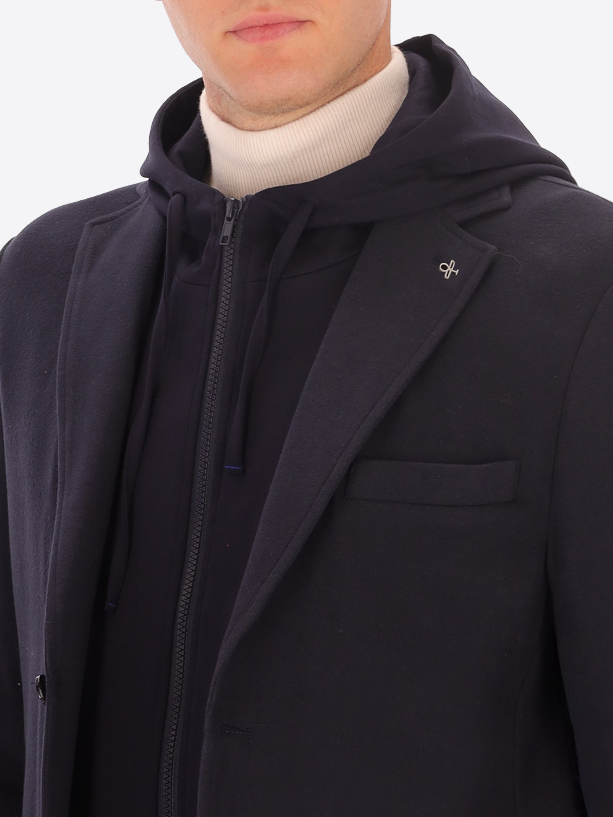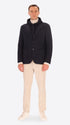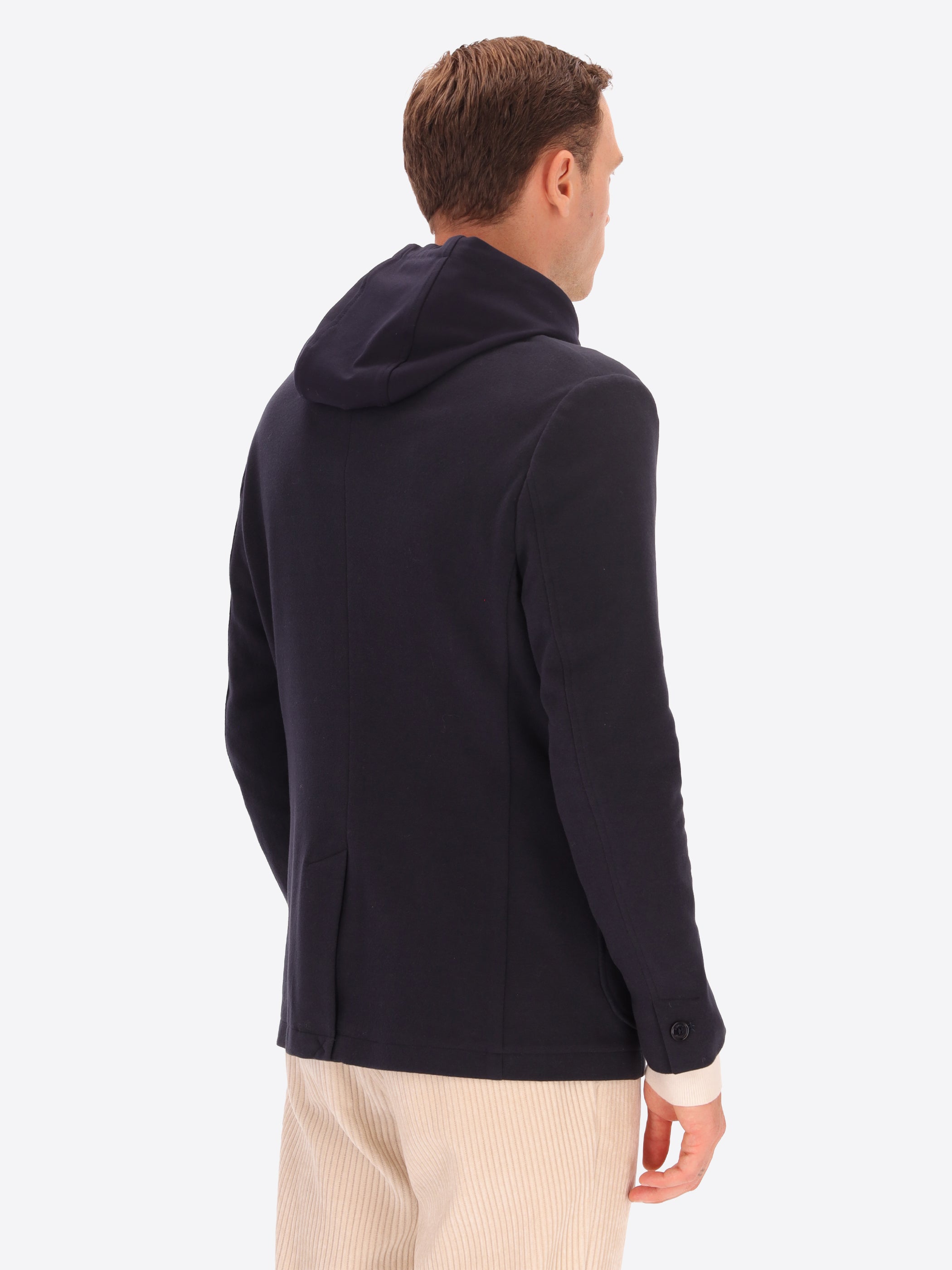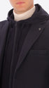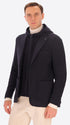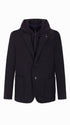 Jacke aus super-comfort Jersey-Gewebe mit warmer Haptik. Das Kleidungsstück verfügt über eine zentrale Knopf- und Schlaufenöffnung, zwei aufgesetzte Taschen vorne, eine Brusttasche, ein ungefüttertes Körperteil mit Kontrastbesätzen, während die Ärmel gefüttert sind, eine Innentasche aus technischem Jersey und einen zentralen Rückenschlitz. Die Jacke enthält eine abnehmbare Kapuze aus Milano-Jersey mit Metallreißverschluss und Nylonreißverschluss zum Befestigen an der Jacke.