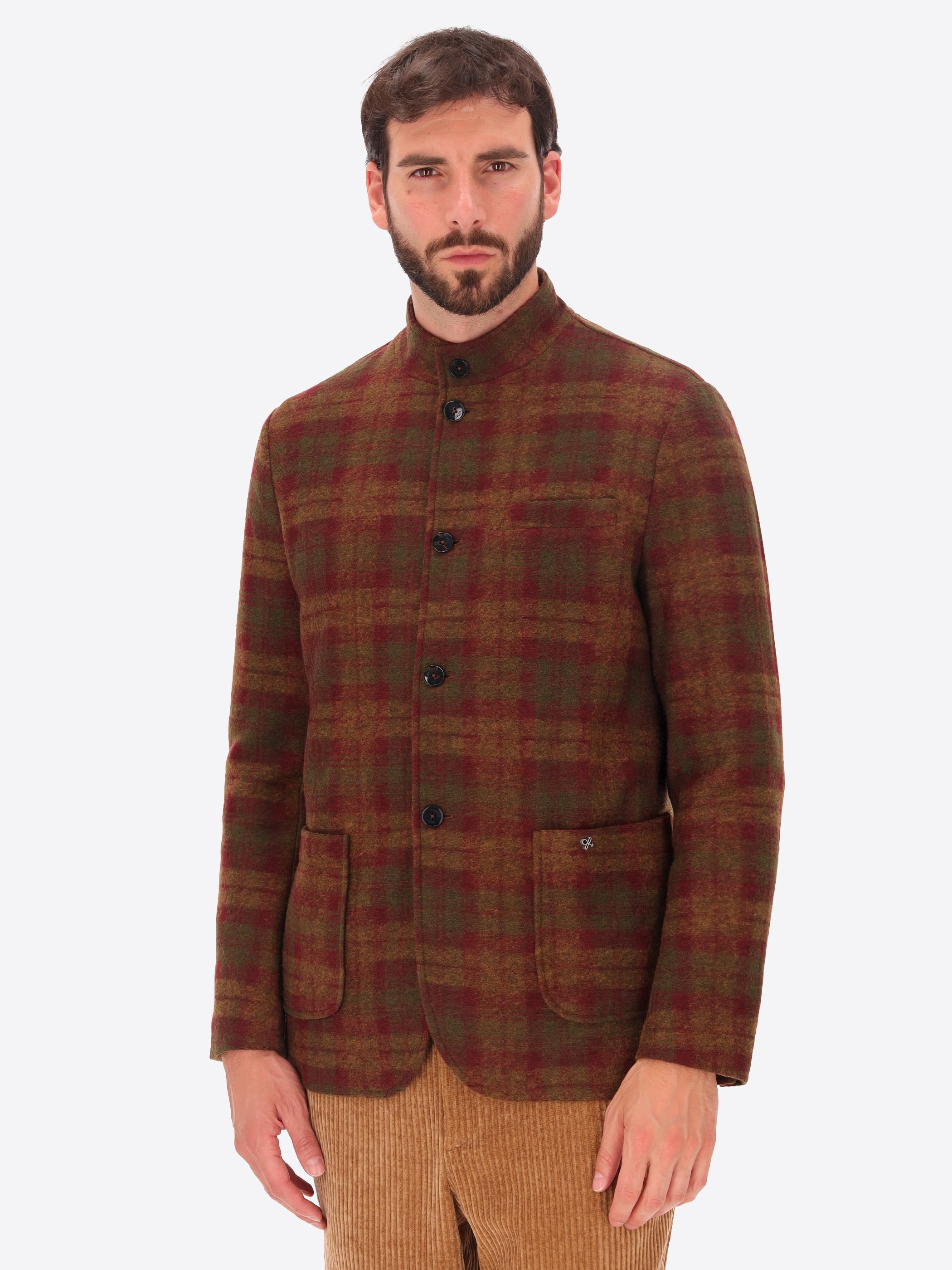 Jacke aus Wollmischgewebe mit karierter Schottenmusterung. Das Modell verfügt über einen Stehkragen, eine mittige Öffnung mit Knopflöchern und Knöpfen, aufgesetzte Taschen und eine Leistentasche auf der Brust. Der Rumpf ist ungefüttert und mit kontrastierenden Einfassungen verarbeitet, die Ärmel sind mit elastischer Futterware gefüttert und innen gibt es eine Tasche aus technischem Punto-Milano-Jersey.