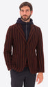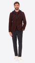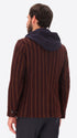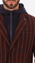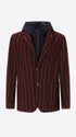 Jacke aus Wollmischgewebe mit Doppelstreifenmuster. Das Kleidungsstück verfügt über einen abnehmbaren Latz mit Kapuze aus technischem Punto Milano Jersey mit Reißverschluss, eine zentrale Öffnung mit Knopflöchern und Knöpfen, zwei aufgesetzte Vordertaschen, eine Leistentasche auf der Brust, einen ungefütterten Rumpf mit kontrastierenden Kanten, während die Ärmel gefüttert sind, eine Innentasche aus technischem Punto Milano Jersey und einen mittigen Schlitz hinten.