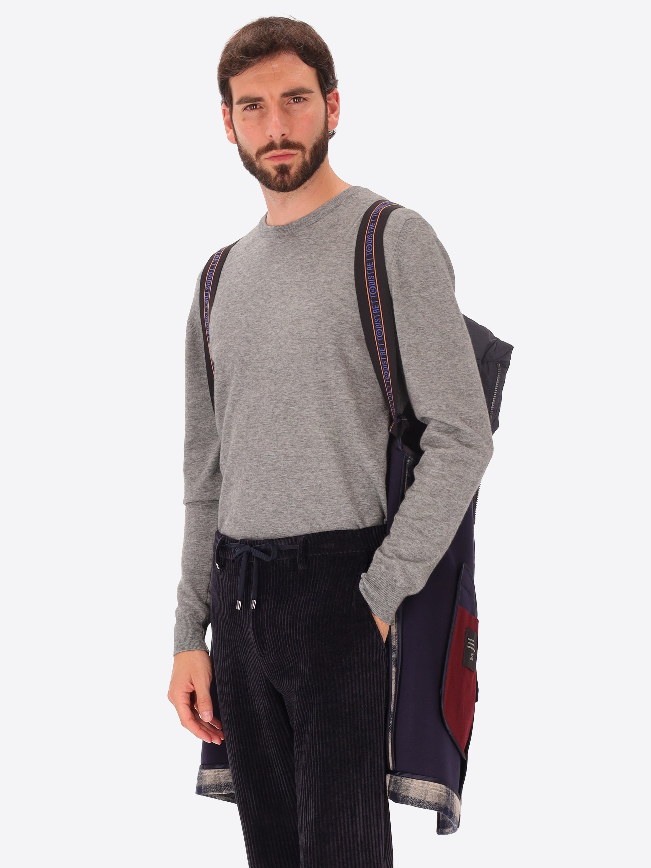 Peacoat aus Walkwolle mit Schottenkaro, kombiniert mit Jersey und Neopren. Das Modell verfügt über Leistentaschen, eine doppelreihige Frontöffnung mit Knopflöchern und Knöpfen, ein ungefüttertes Innere mit kontrastierenden Einfassungen, eine Innentasche aus Punto-Milano-Strick sowie einen vollständig ungefütterten Rumpf. Ergänzt wird das Design durch einen abnehmbaren Nylon-Brusteinsatz mit wattierter Kapuze und abnehmbare elastische Träger mit Logo im Inneren.