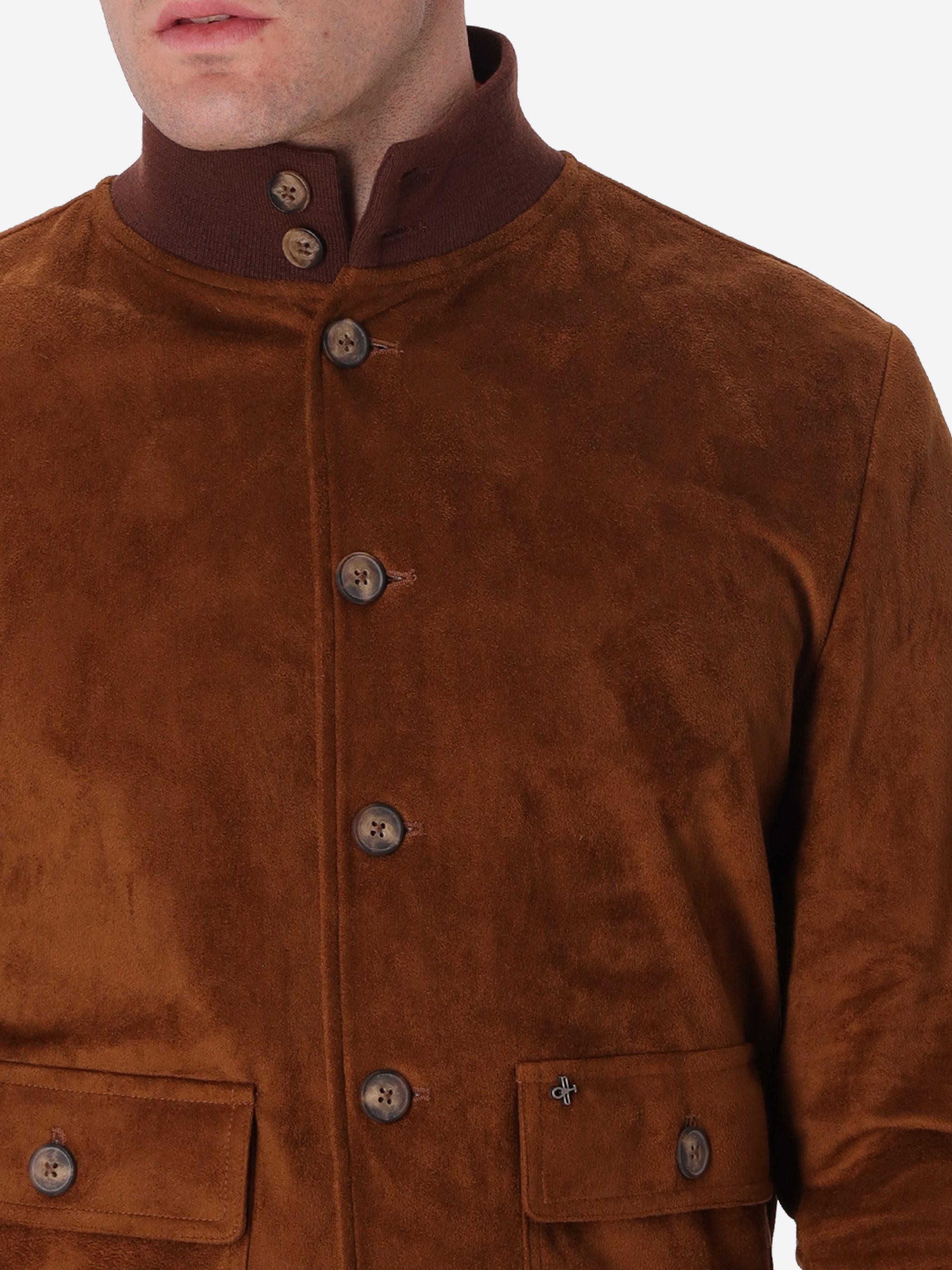 Bomber aus Eco-Wildleder, innen mit meliertem Jersey kaschiert. Mit Knopfloch-und-Knopf-Verschluss sowie 1x1 Rippkragen, -Saum und -Bündchen. Ausgestattet mit Pattentaschen, kontrastierender Innentasche und Kontrastband-Einfassungen bei ungefüttertem Innenaufbau.