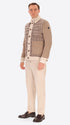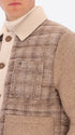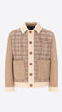 Fliegerjacke aus einer Stoffmischung, die die FW25/26-Kollektion repräsentiert. Gewebte Wollstoffe mit Thermovlies und Nylon gesteppt, Wollstoff mit Neopren und Rock Samt immer kombiniert mit Viskose-Jersey und Neopren. Das Modell verfügt über eine mittige Knopfleiste, Leistentaschen, eine aufgesetzte Brusttasche, einen Segelkragen, Hemdärmelabschlüsse; die Ärmel sind ungefüttert und es hat ikonische elastische Träger mit Logo.