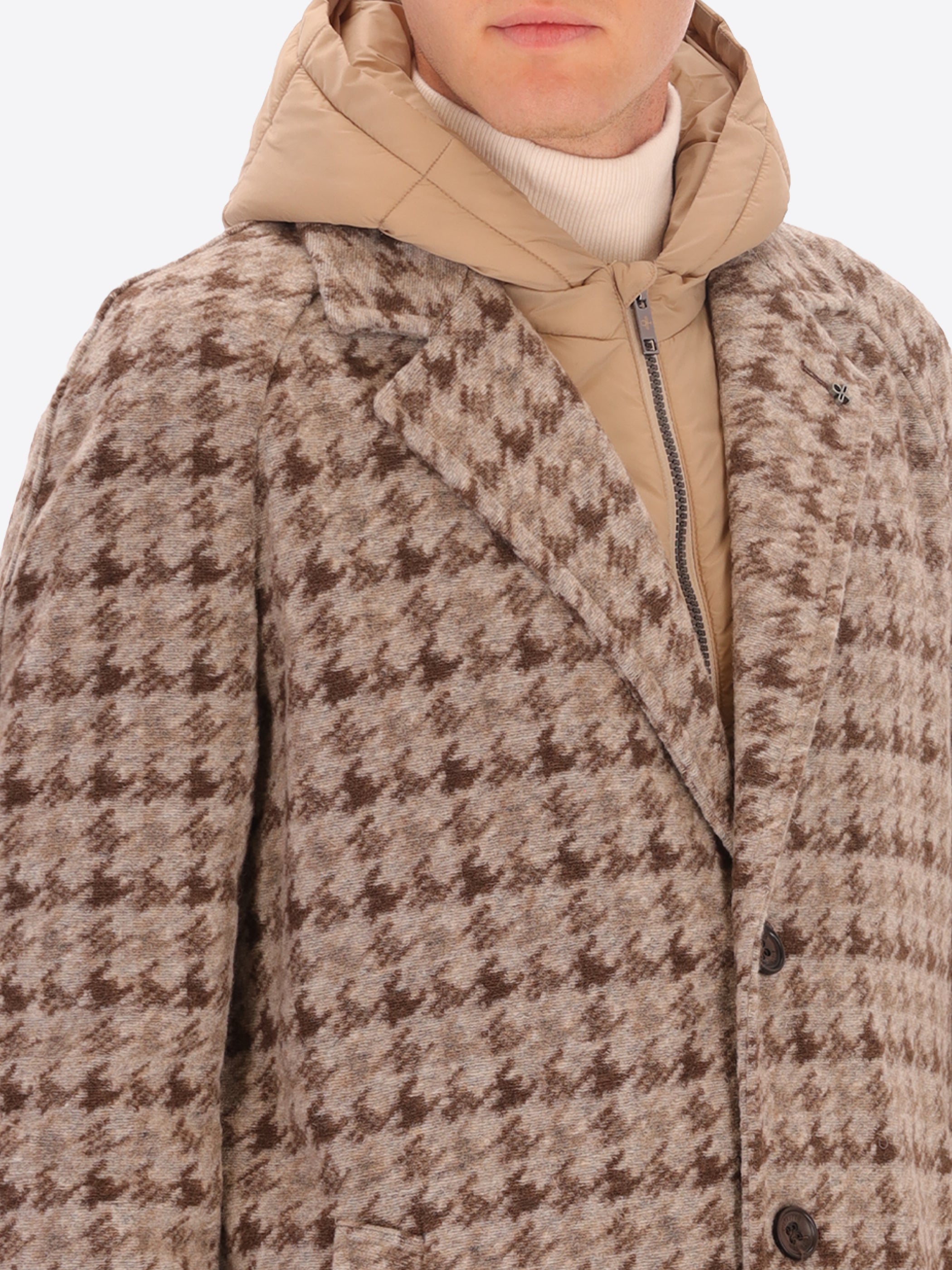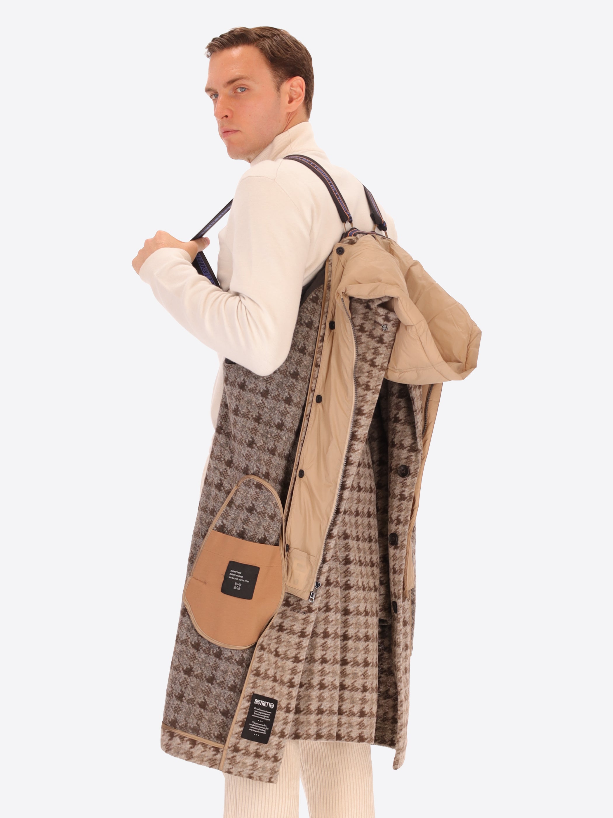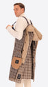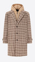 Raglanmantel aus nadelgestanztem Wollmischgewebe mit Hahnentrittmuster. Das Modell verfügt über aufgesetzte Taschen mit Patte, eine Frontöffnung mit drei Knöpfen, einen ungefütterten Rumpf mit kontrastierenden Einfassungen, gefütterte Ärmel sowie eine Innentasche aus Punto-Milano-Strick. Innen sorgen kontrastierende Einfassungen, abnehmbare elastische Träger mit Logo und ein abnehmbarer wattierter Nylon-Brusteinsatz mit Kapuze für zusätzlichen Komfort; ein einzelner Schlitz in der hinteren Mitte vollendet das Design.