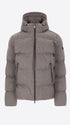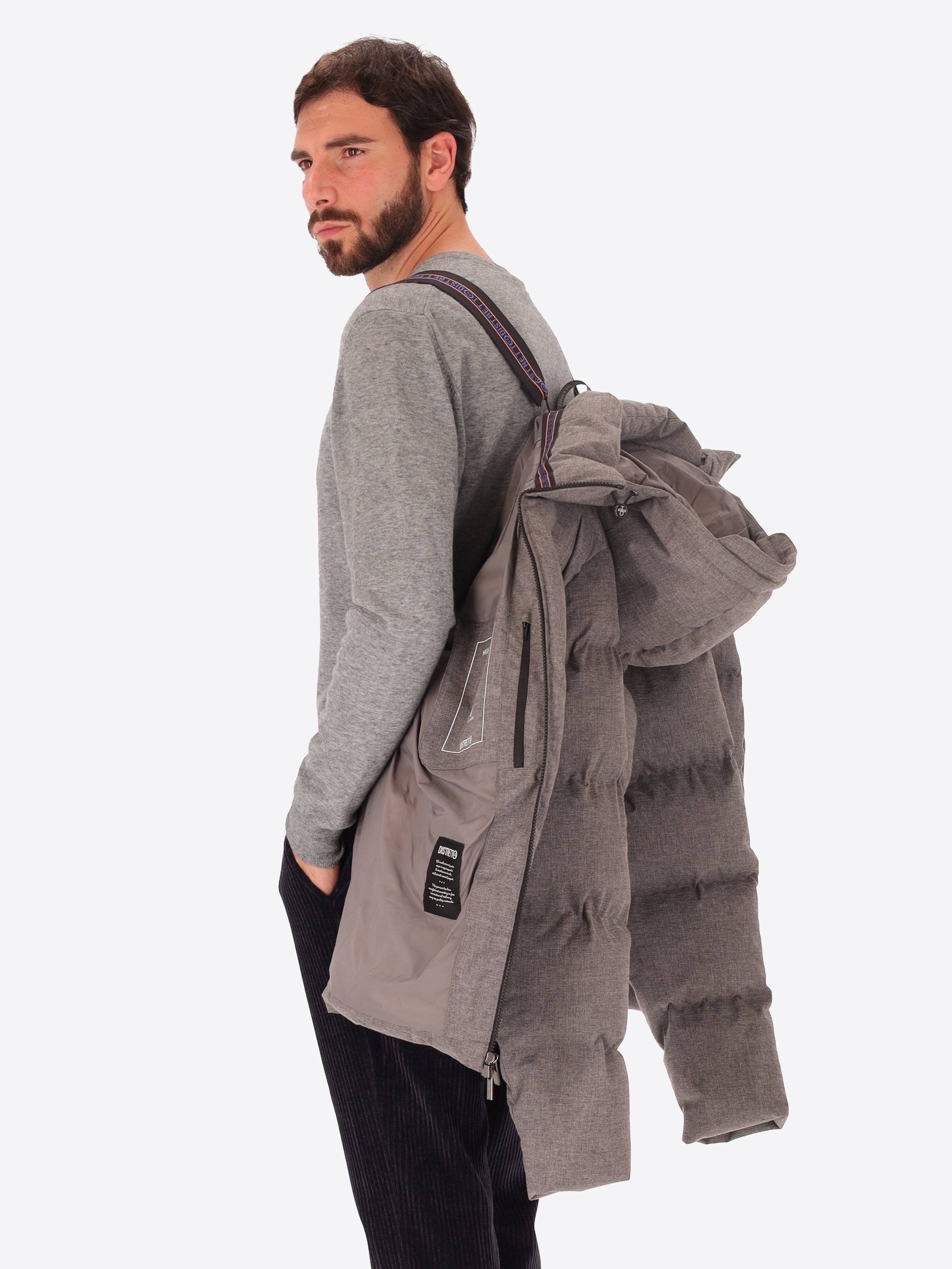 Kapuzenjacke aus technischem Gewebe mit warmem Griff und Mikro-Fischgrätmuster, wasserabweisend und winddicht. Das Modell verfügt über einen frontalen Reißverschluss, Reißverschlusstaschen, einen vollständig mit technischem Stoff gefütterten Rumpf mit Innentaschen mit Reißverschluss sowie die charakteristischen abnehmbaren elastischen Träger mit Logo im Inneren. Die Wattierung besteht aus technischer Füllung, die sich der Körperwärme anpasst und temperaturregulierend wirkt.