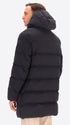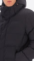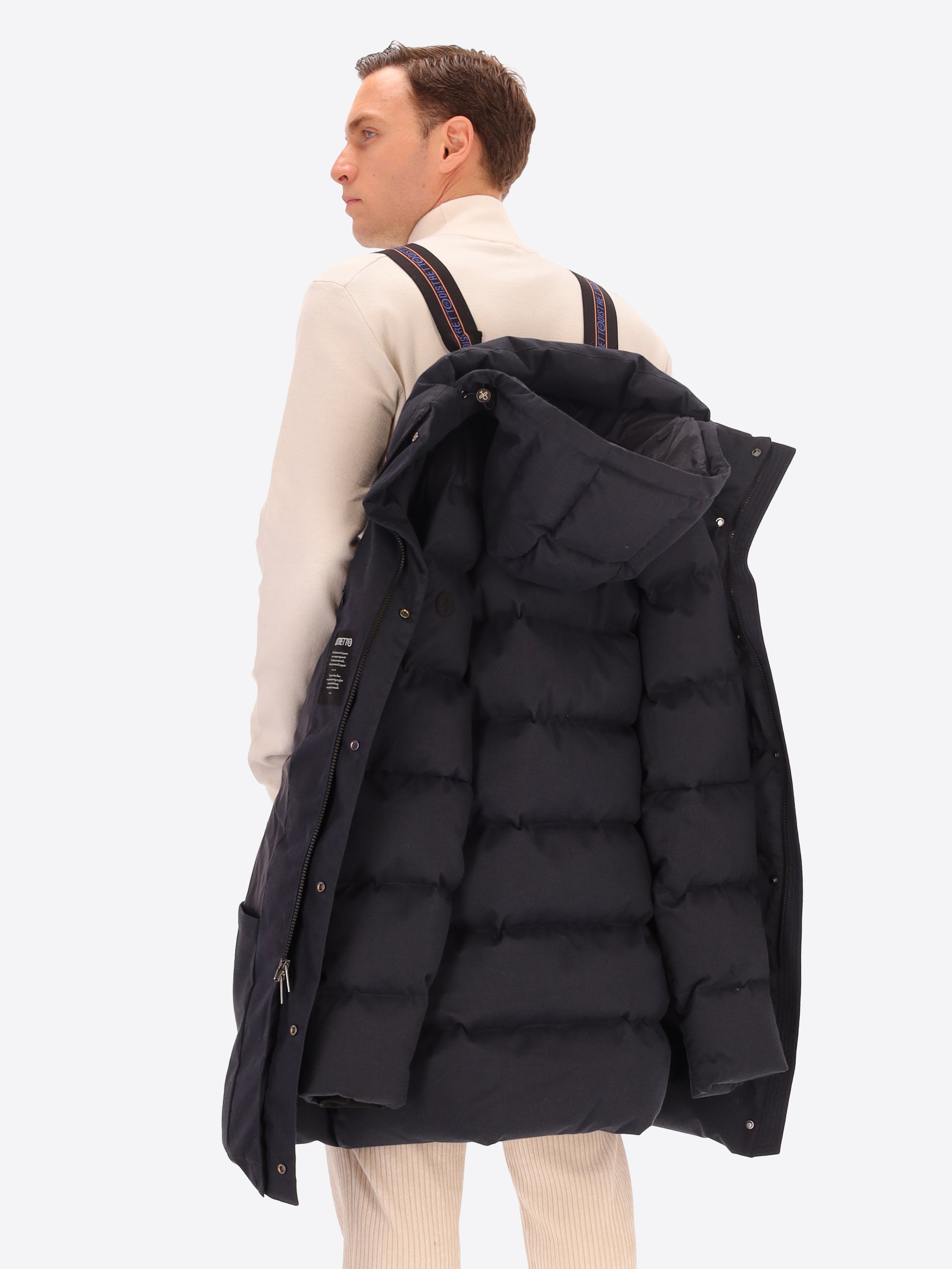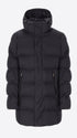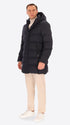 Parka mit Kapuze aus technischem Gewebe mit warmem Griff und Mikro-Fischgrätmuster, wasserabweisend und winddicht. Das Modell verfügt über einen frontalen Reißverschluss, Reißverschlusstaschen, einen vollständig mit technischem Stoff gefütterten Rumpf mit Innentaschen mit Reißverschluss sowie die charakteristischen abnehmbaren elastischen Träger mit Logo im Inneren. Die Wattierung besteht aus technischer Füllung, die sich der Körperwärme anpasst und temperaturregulierend wirkt.