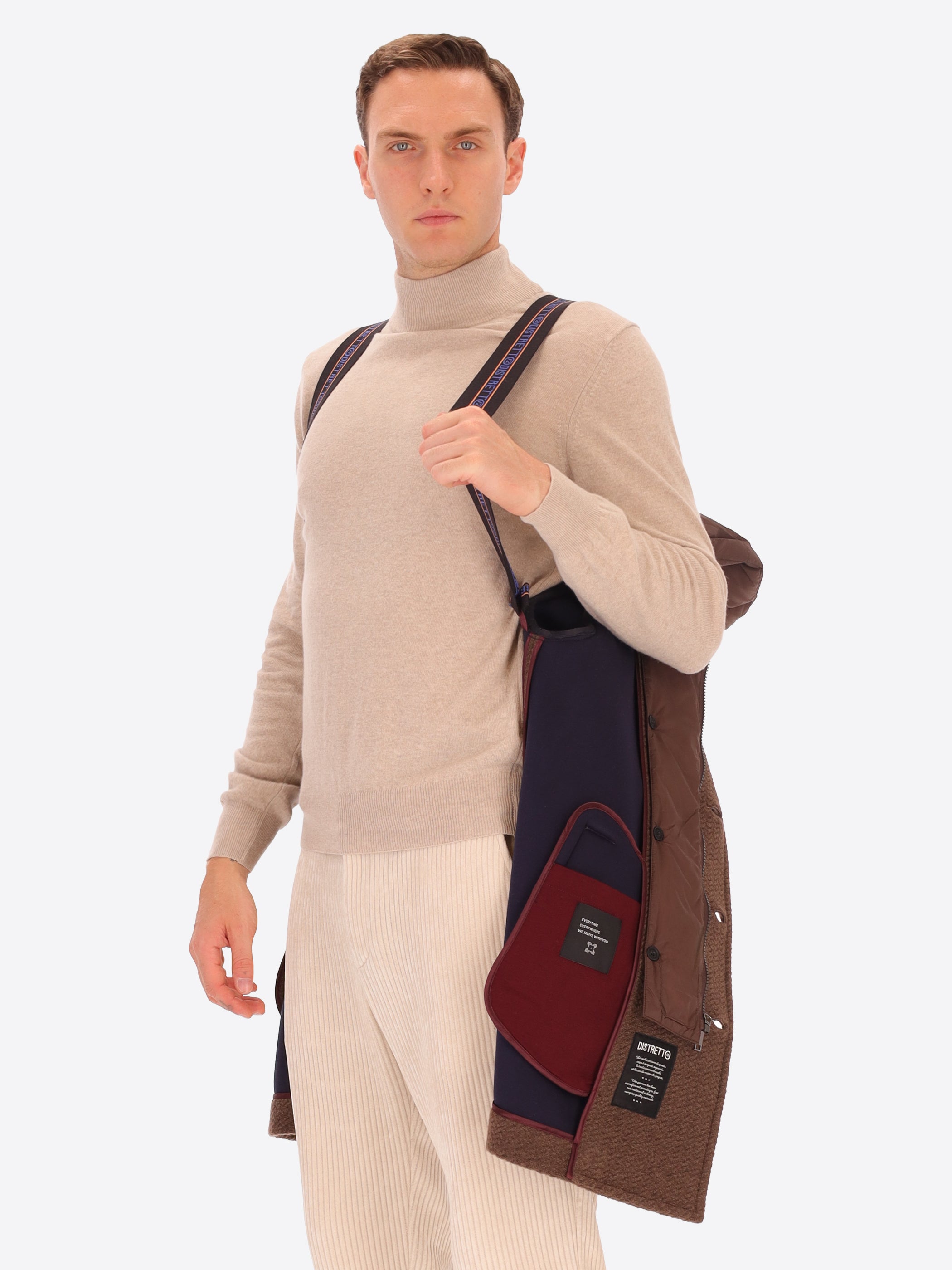 Peacoat in boiled wool combined with jersey and neoprene, featuring a double-breasted front with buttonholes and buttons, two welt pockets, and an unlined interior with contrasting edges and a Milano stitch jersey inner pocket. Inside, there are 2 detachable elastic braces with logo. The coat also includes a detachable hooded bib in padded nylon.