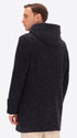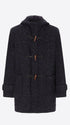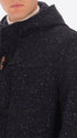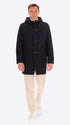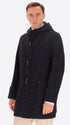 Montgomery coat in boiled wool blend fabric. The garment features a front opening with zip and wooden toggles, two welt pockets with quilted padded lining inside the body and hood, an inner pocket in Milano stitch, and two detachable elastic straps with logo. Single back vent.