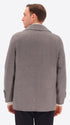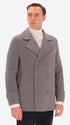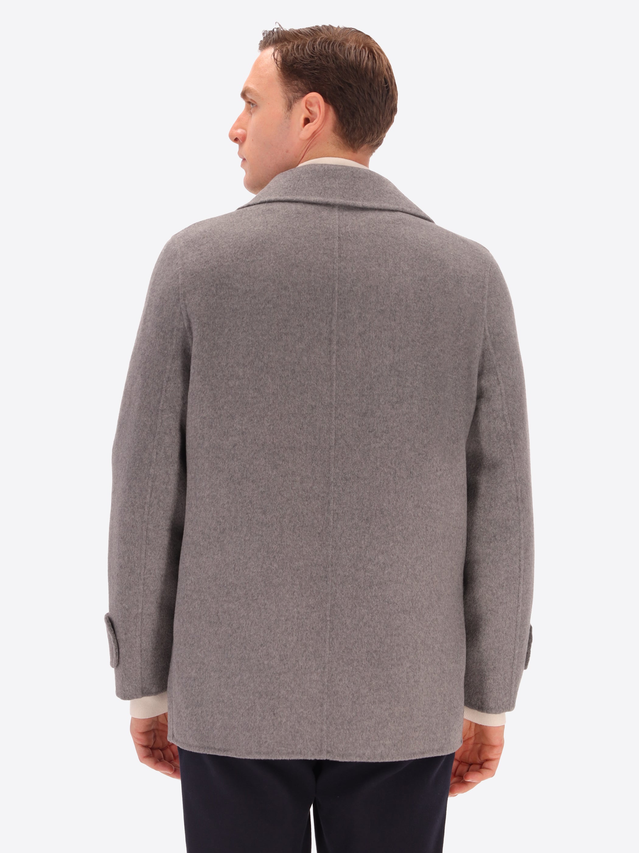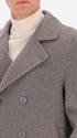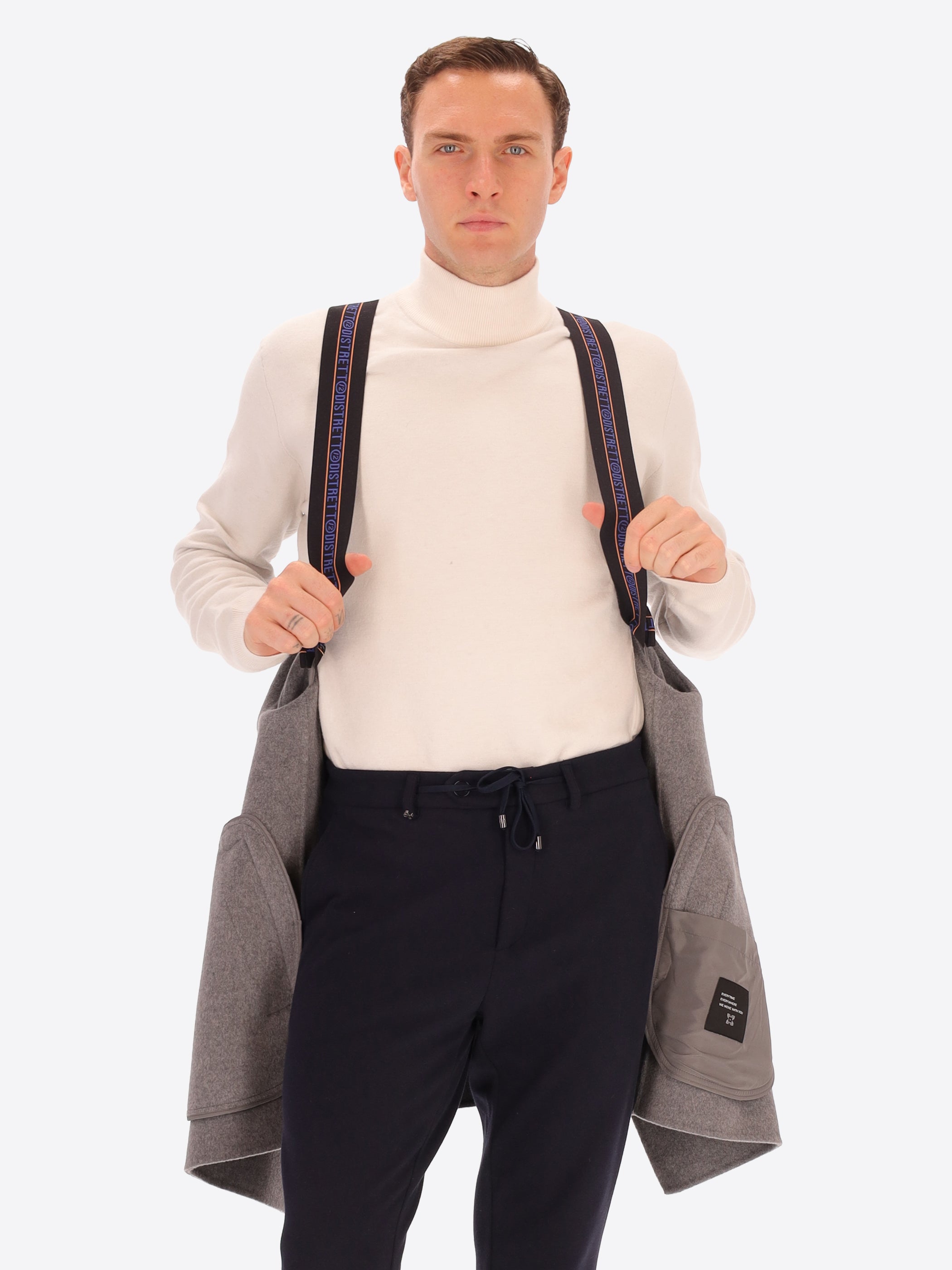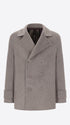 Peacoat in double fabric wool blend. The coat features a double-breasted opening with buttonholes and buttons, two welt pockets, and a fully unlined body with a contrast internal pocket. Inside, there are also 2 detachable elastic braces with logo.
