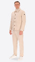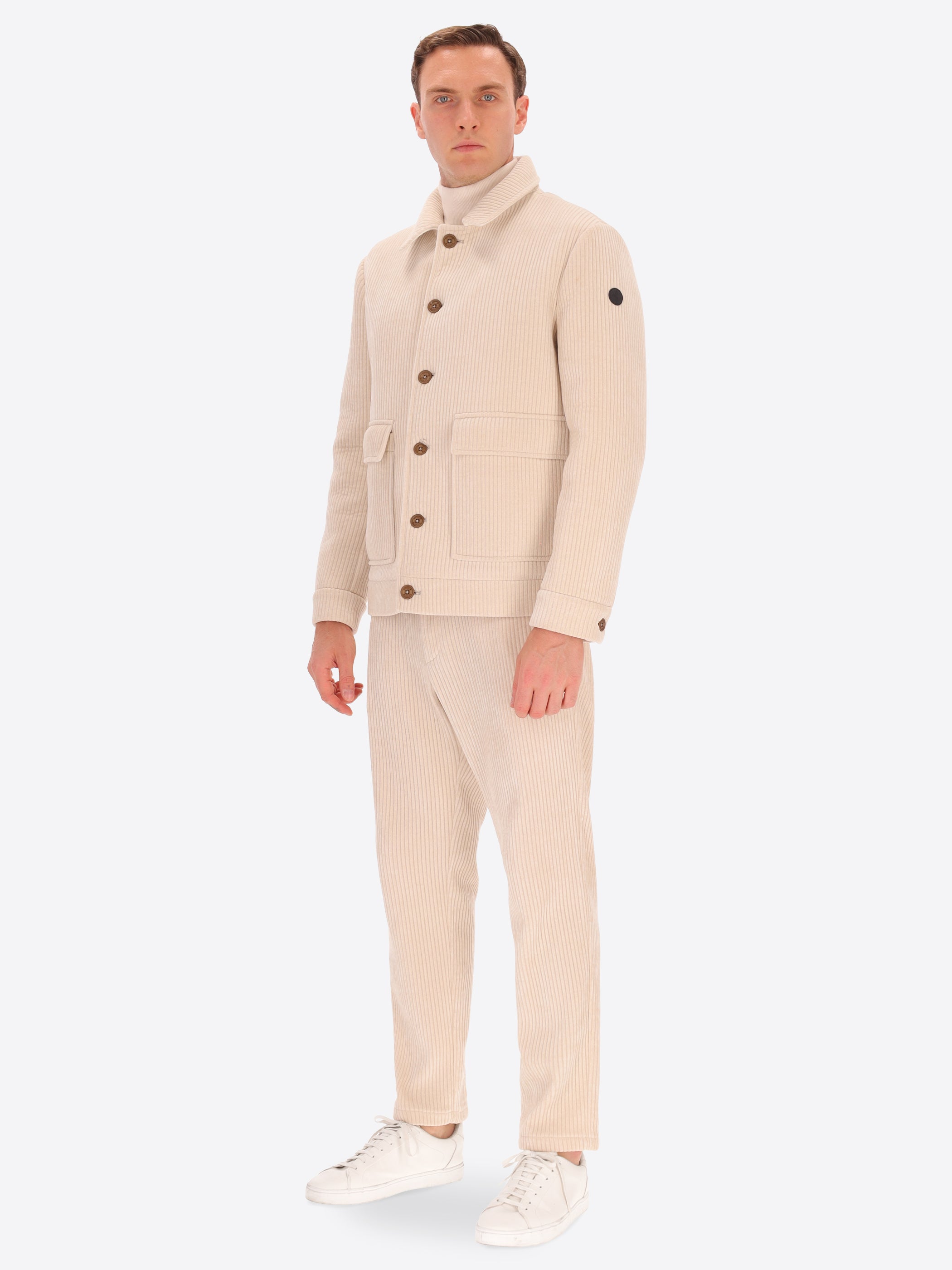Aviator jacket in French ribbed velvet combined with jersey and super-comfort neoprene. The garment features a buttonhole and button closure, shirt collar, shirt cuffs, two patch pockets with flaps, and an unlined interior with contrasting edges and a Milano stitch jersey inner pocket. Inside, there are also 2 detachable elastic braces with logo.
