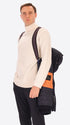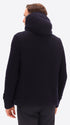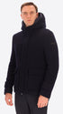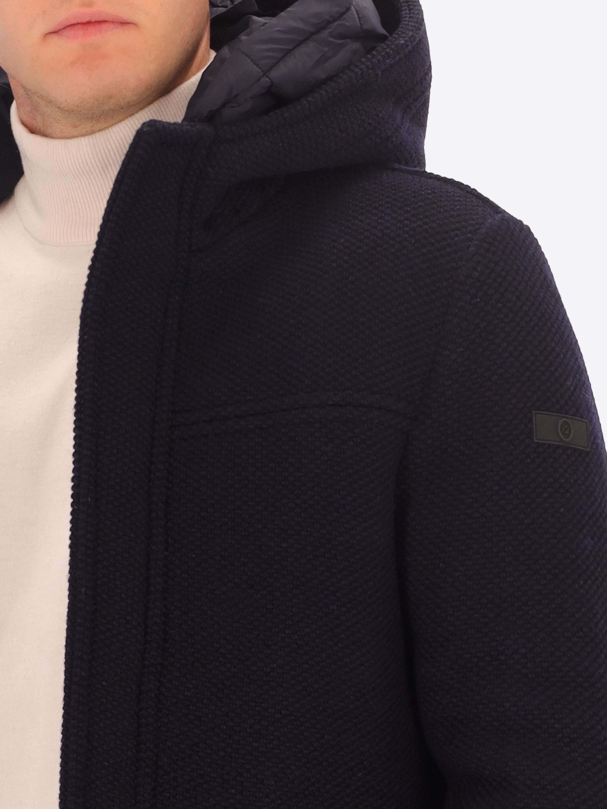 Hooded jacket made of wool piqué fabric. The garment features a zip and hidden snap button closure, two patch pockets with flaps, and a side opening. The interior is fully lined with quilted padding and includes a contrasting nylon inner pocket. Inside, there are also 2 detachable logo elastic braces. The jacket is equipped with an additional detachable padded nylon hood.
