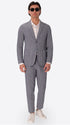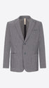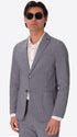 Single-breasted jacket crafted in Faster12 super-stretch fabric with alternating raised stripe texture, featuring a two-button front closure, front patch pockets and a high welt chest pocket. The interior is fully unlined with cotton bias binding and a contrast inner pocket.