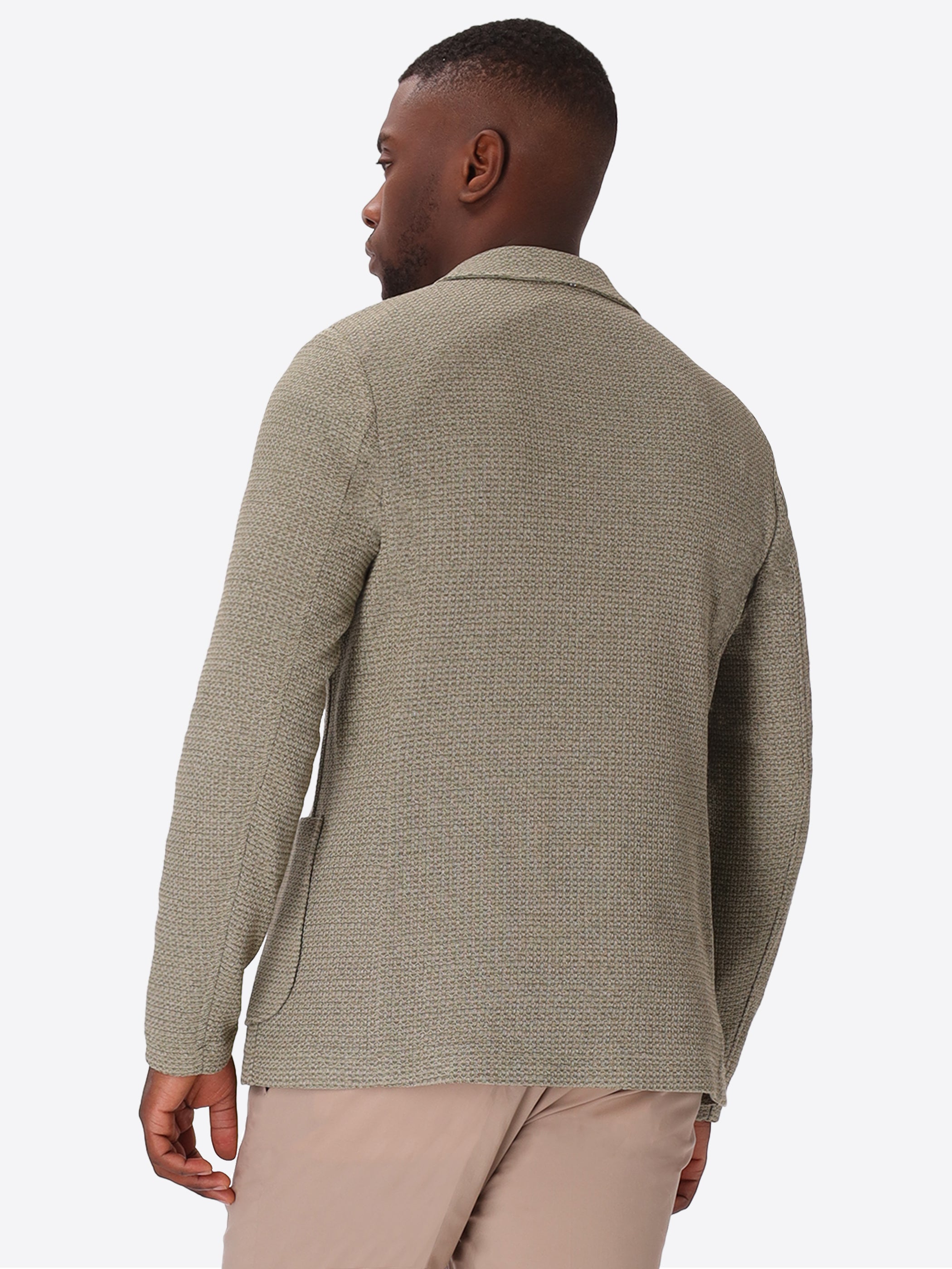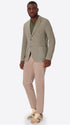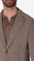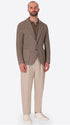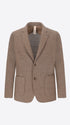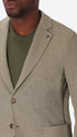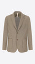 Single-breasted jacket developed in melange stretch jersey knit fabric, designed with a clean two-button fastening and functional patch pockets. The interior construction is unlined with cotton bias finishing and a contrast inner pocket.