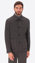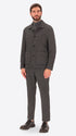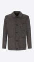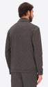 Shirt jacket made from super-comfort jersey fabric with micro-pattern design. The garment features a central button closure with buttonholes, two front patch pockets, a third patch pocket on the chest, a shirt collar, cuffs with one button, unlined body with contrast edges, lined sleeves, and a technical Milano jersey inner pocket.