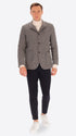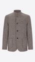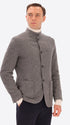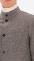 Shirt jacket in solid/melange mixed wool fabric. The garment features a central button and loop closure, two patch front pockets, a chest patch pocket, and a coreana collar. The body is unlined with contrast trims while the sleeves are lined, with an internal technical jersey Milano pocket.