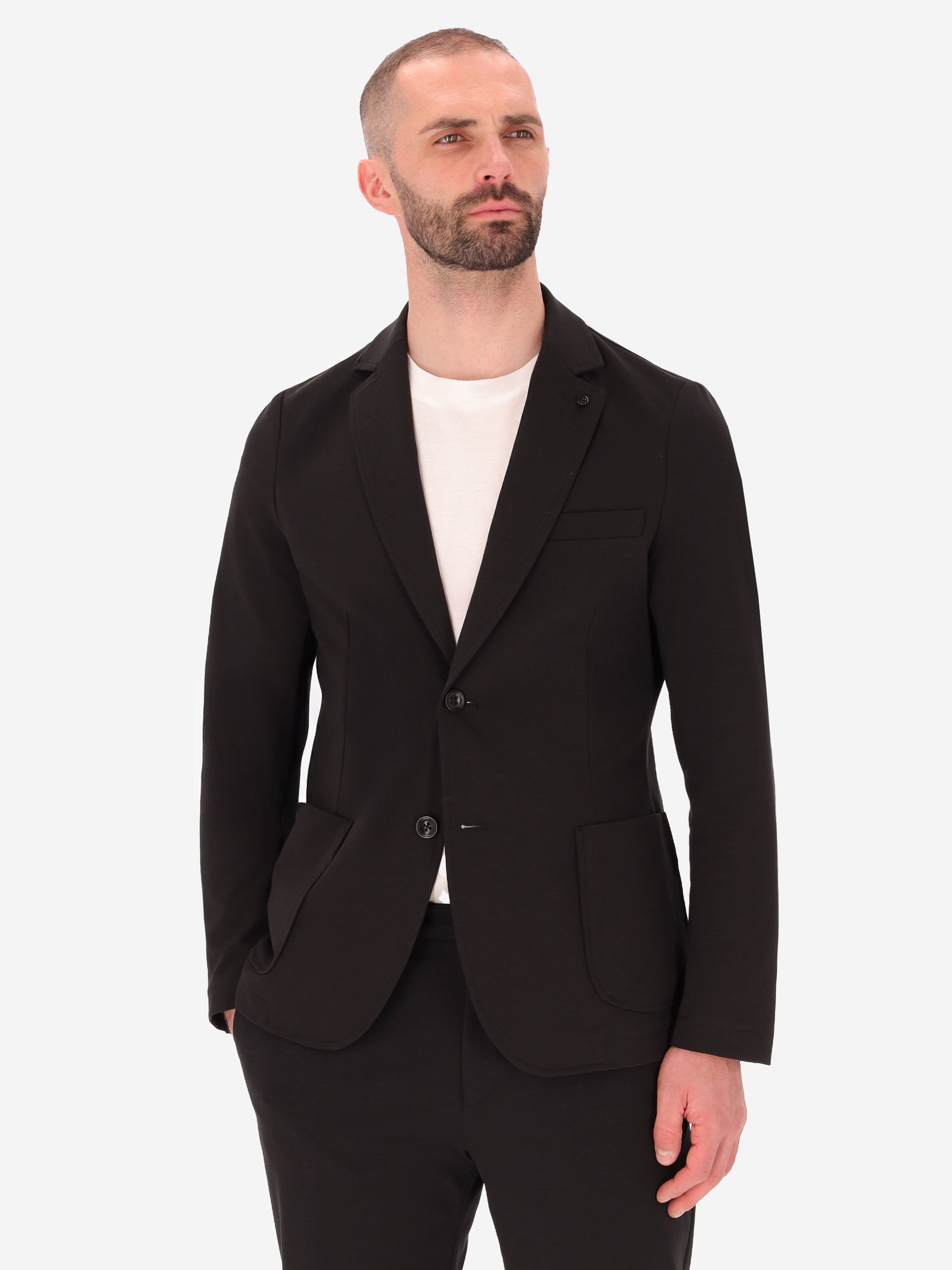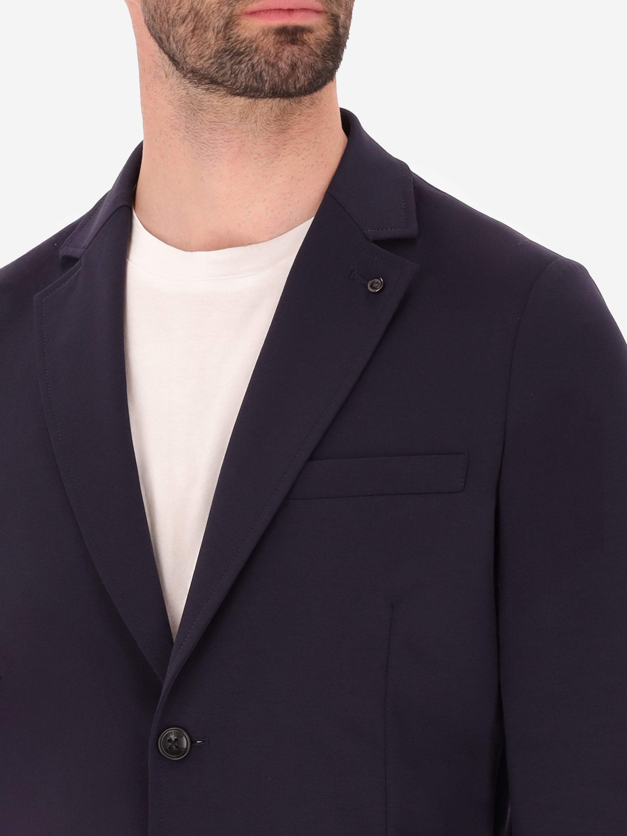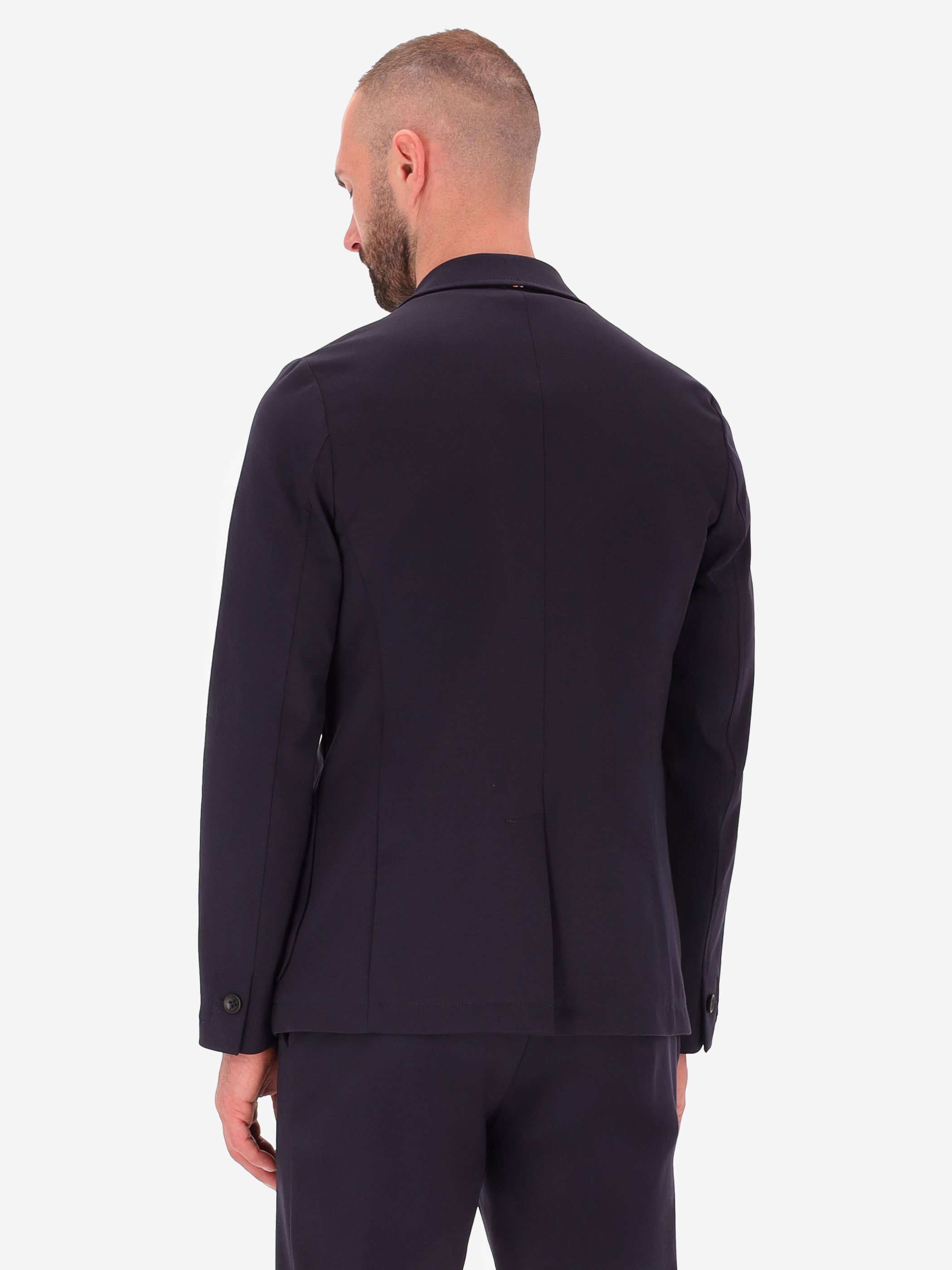 Single-breasted jacket crafted from solid-colour technical Punto Milano fabric. The design features a two-button front fastening, front patch pockets and a welt chest pocket. The back is semi-lined and finished with contrast internal edges, while the sleeves are fully lined. A nylon internal pocket, classic notched lapels and a center back vent complete the style.
