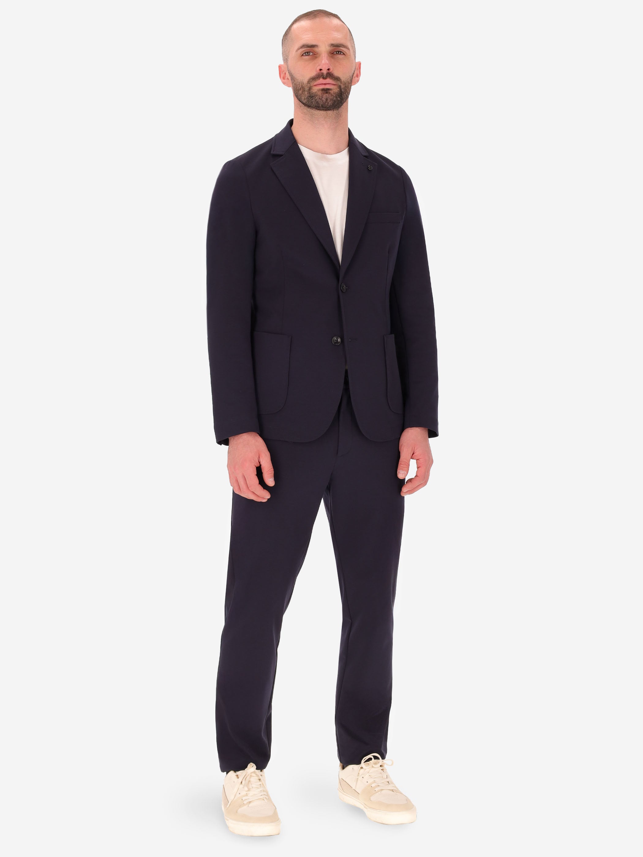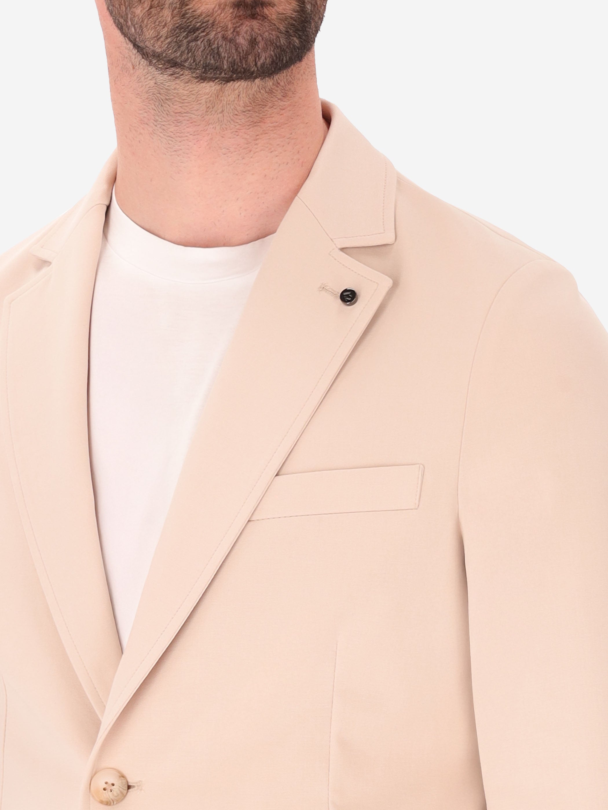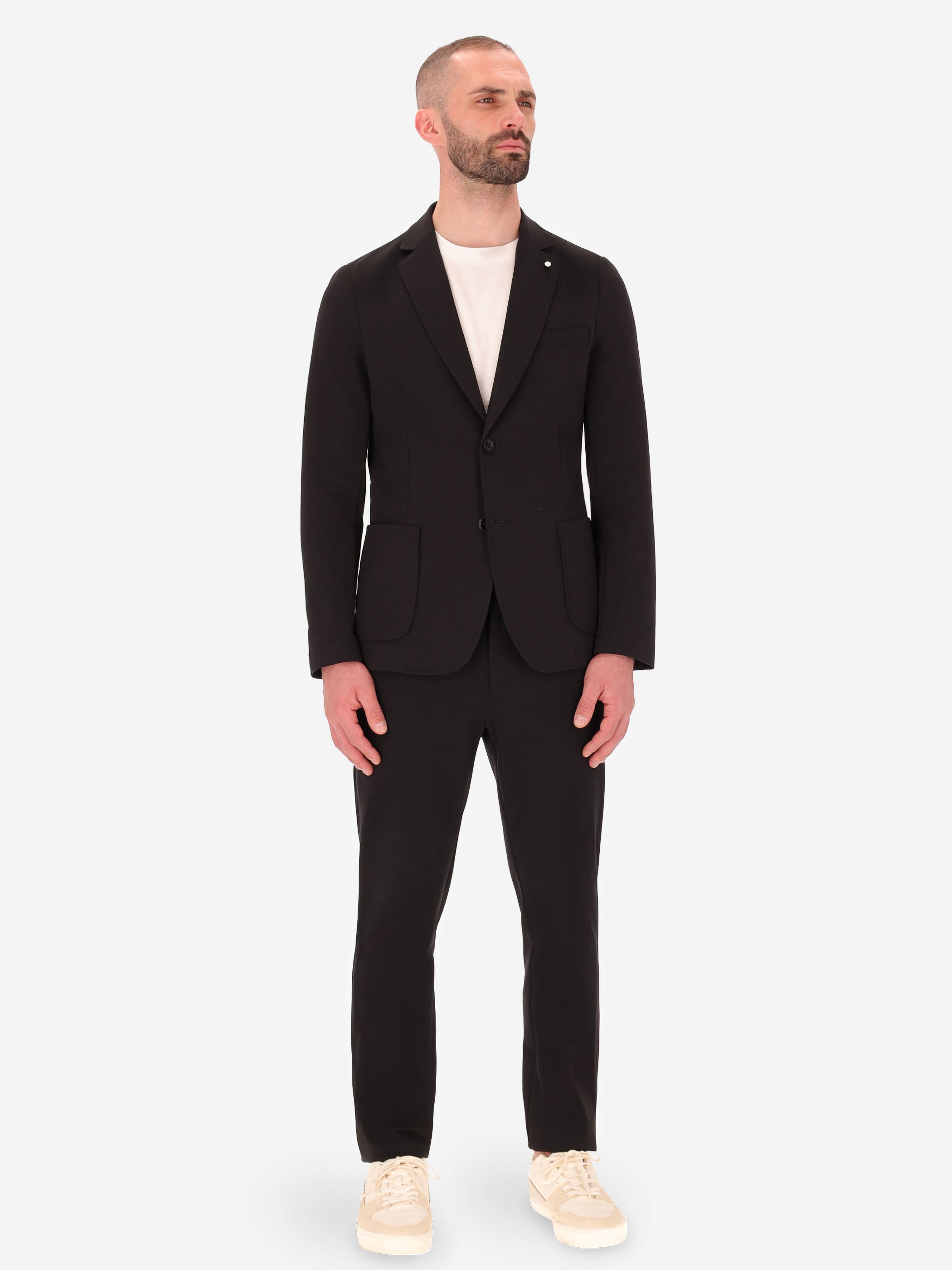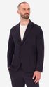 Single-breasted jacket crafted from solid-colour technical Punto Milano fabric. The design features a two-button front fastening, front patch pockets and a welt chest pocket. The back is semi-lined and finished with contrast internal edges, while the sleeves are fully lined. A nylon internal pocket, classic notched lapels and a center back vent complete the style.