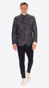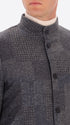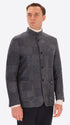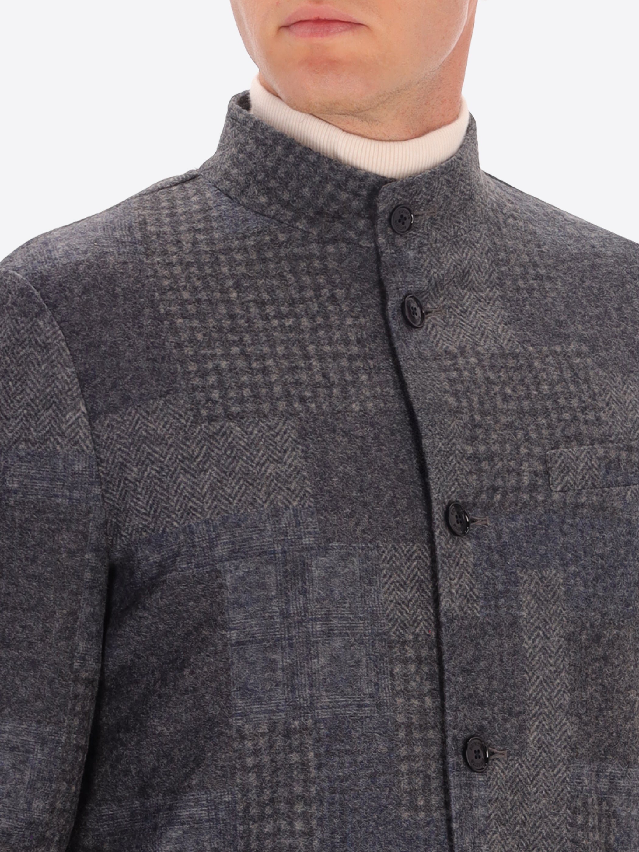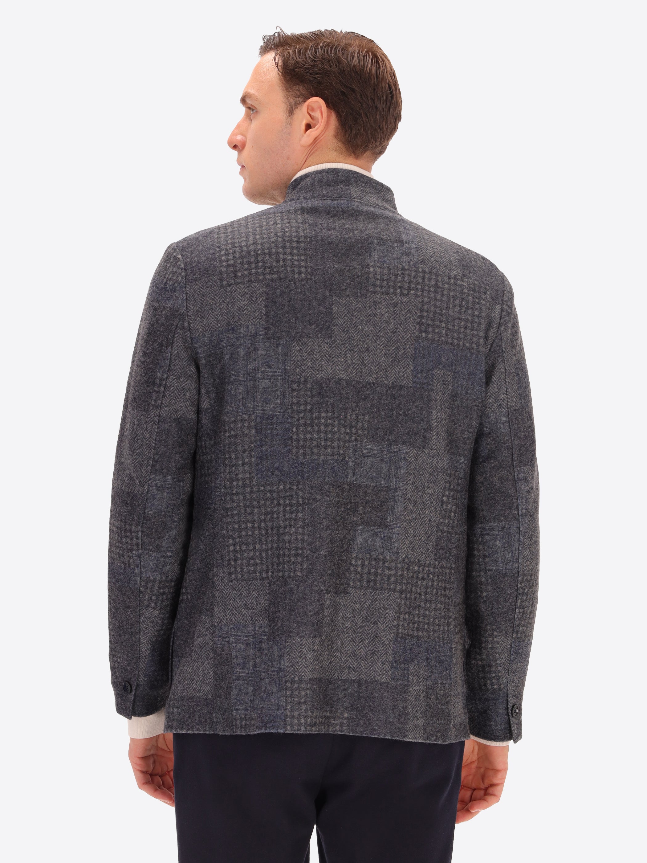 Jacket in wool-blend fabric with tartan-inspired patchwork pattern. The garment features a band collar, central opening with buttonholes and buttons, front patch pockets and a welt breast pocket. The body is unlined with contrast binding, while the sleeves are lined with stretch lining and there is an internal pocket in technical Punto Milano jersey.