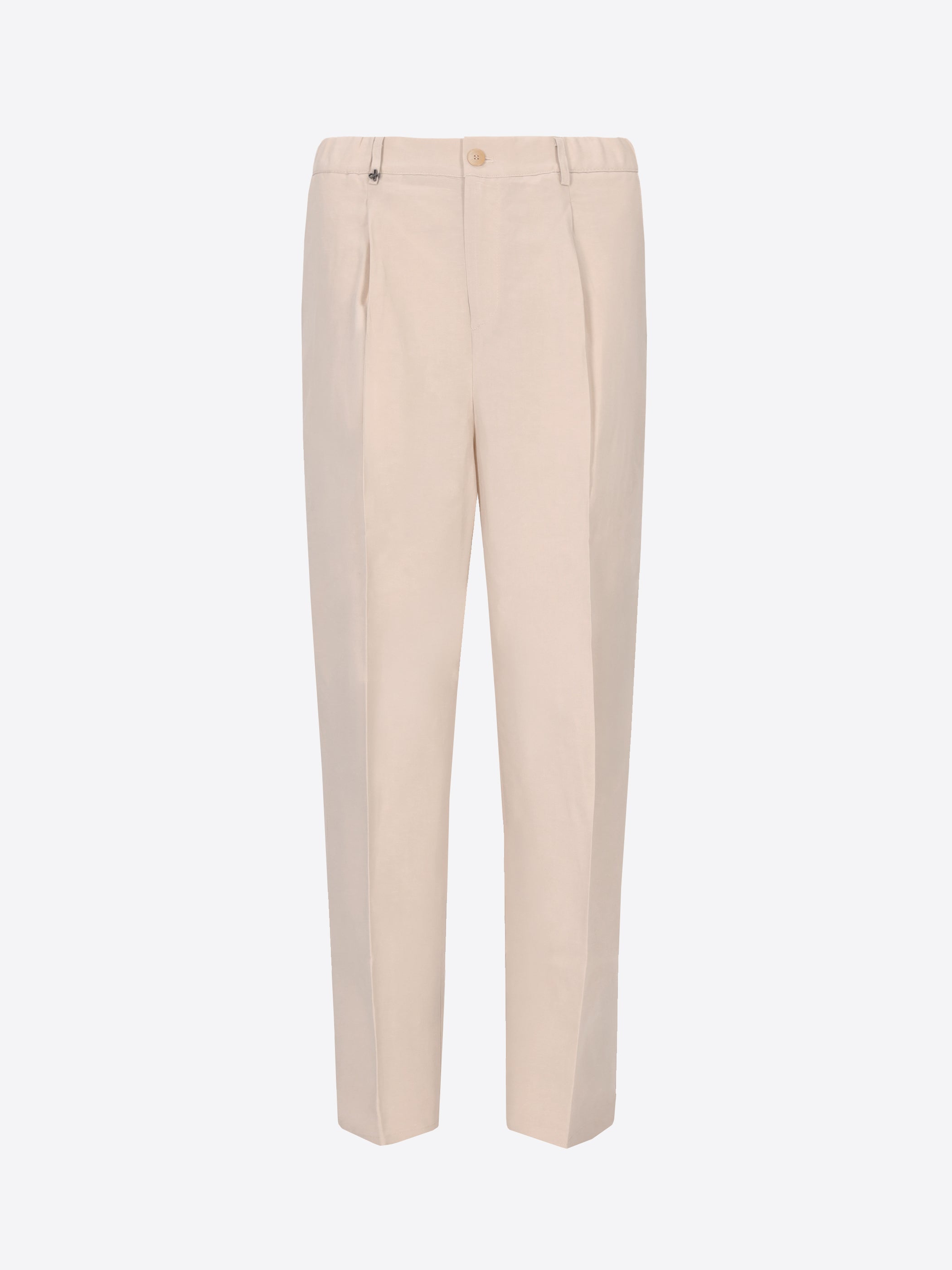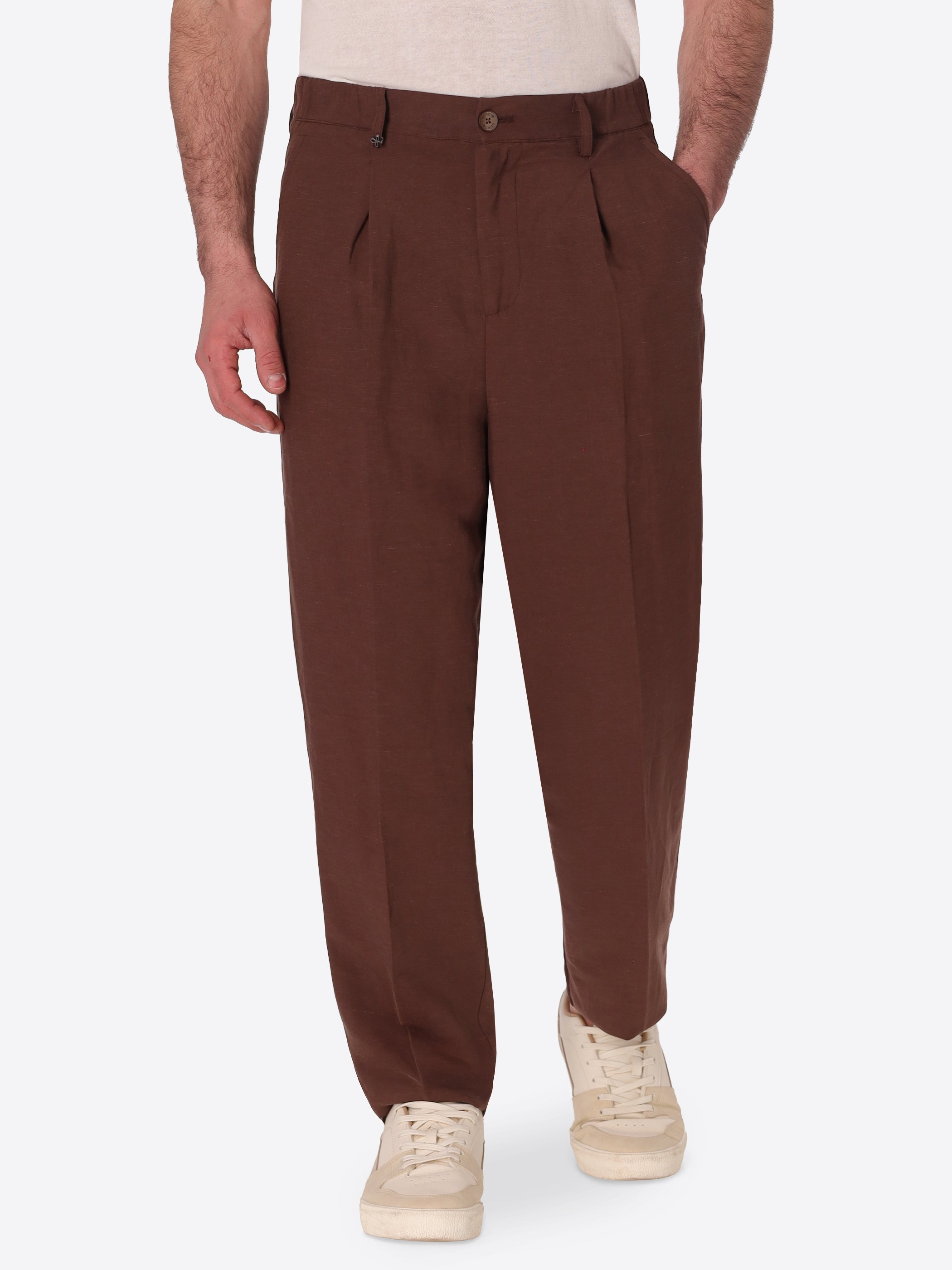 Ban trousers with pleats and wide leg tapering towards the hem, crafted in lightweight and extremely fresh linen-viscose blend fabric. Featuring French front pockets, back welt pockets and waistband button fastening.
