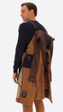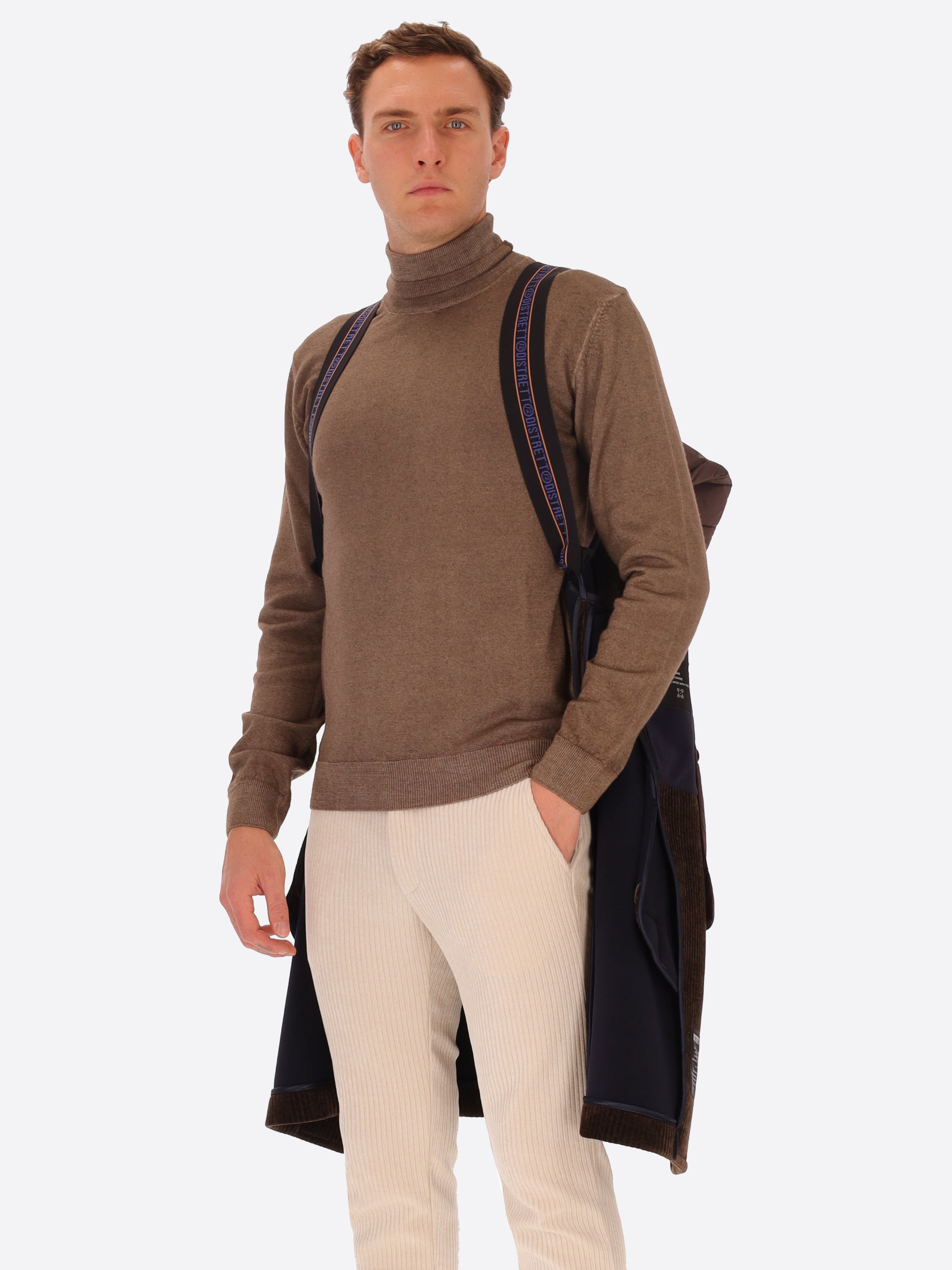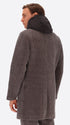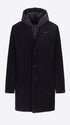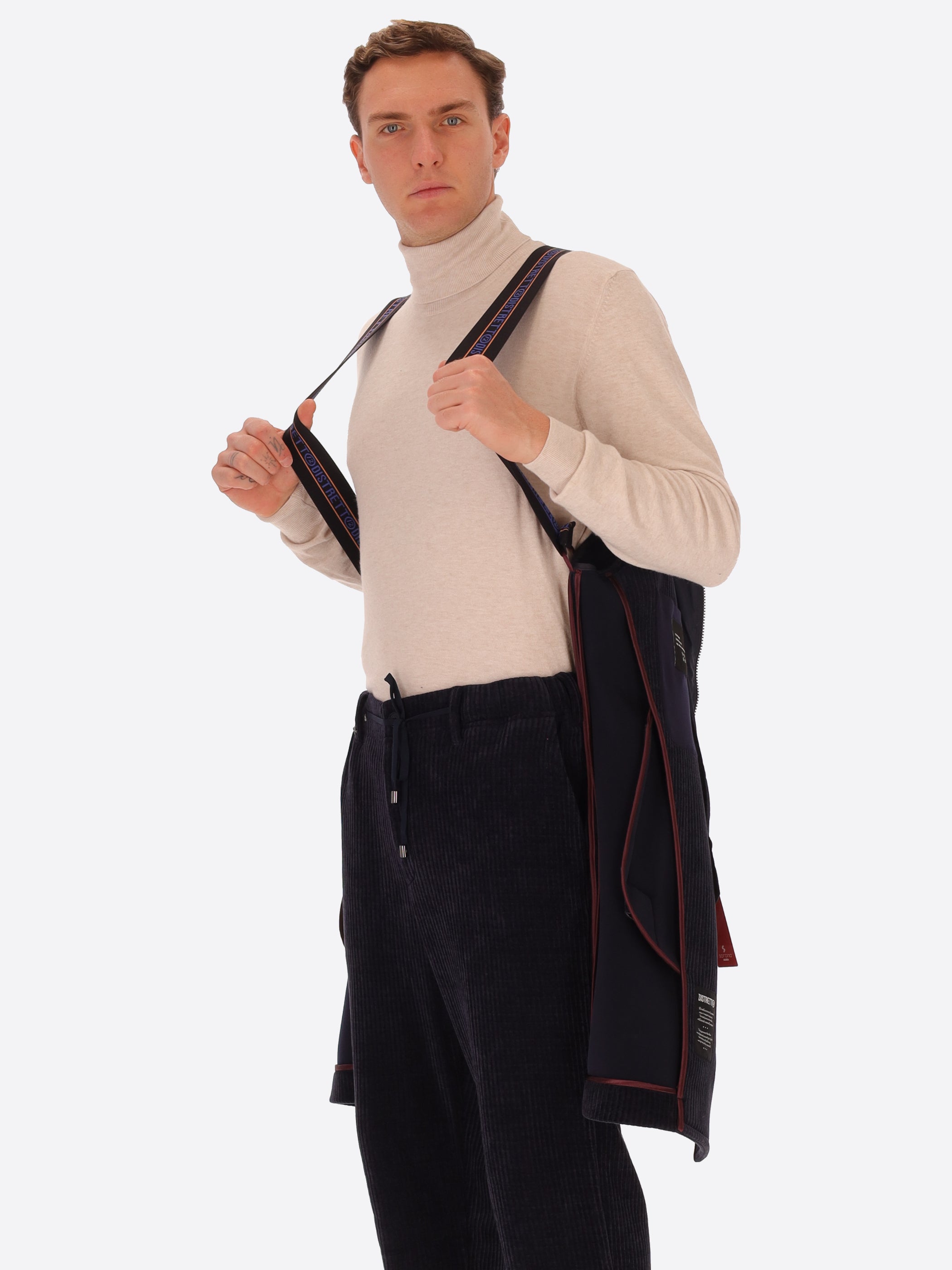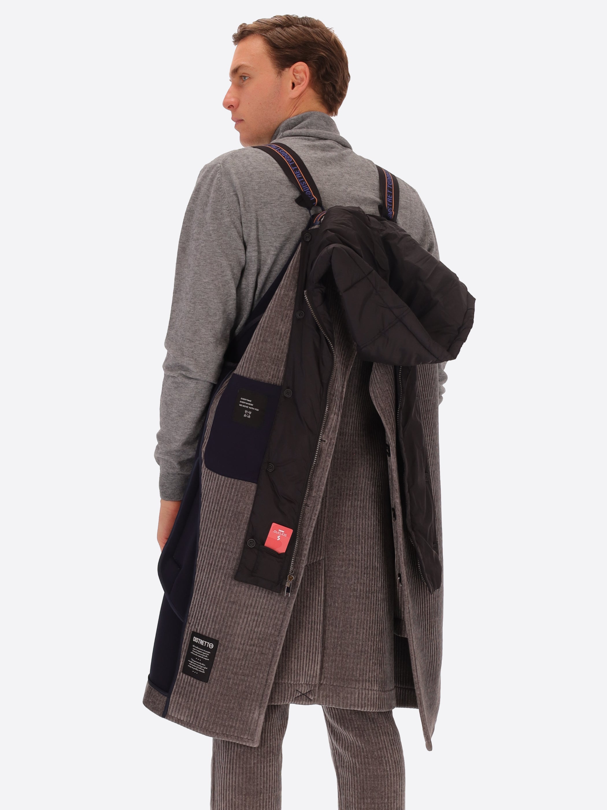 Coat in French ribbed velvet combined with jersey and super-comfort neoprene. The garment features a 3-button closure, two welt pockets, and an unlined interior with contrasting edges and a Milano stitch jersey inner pocket. Inside, there are also 2 detachable elastic braces with logo. In addition, the coat has a detachable padded nylon bib with hood.