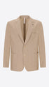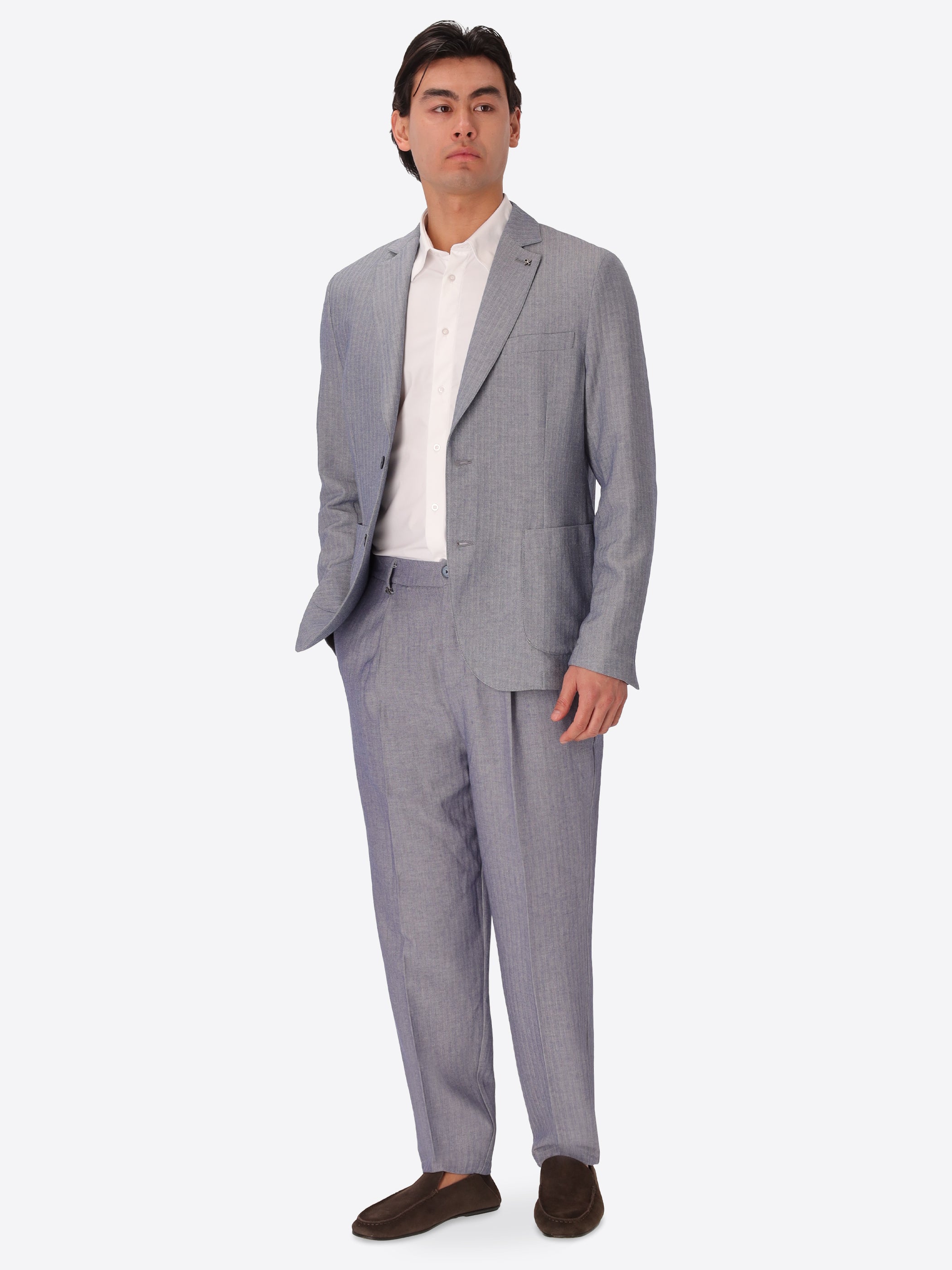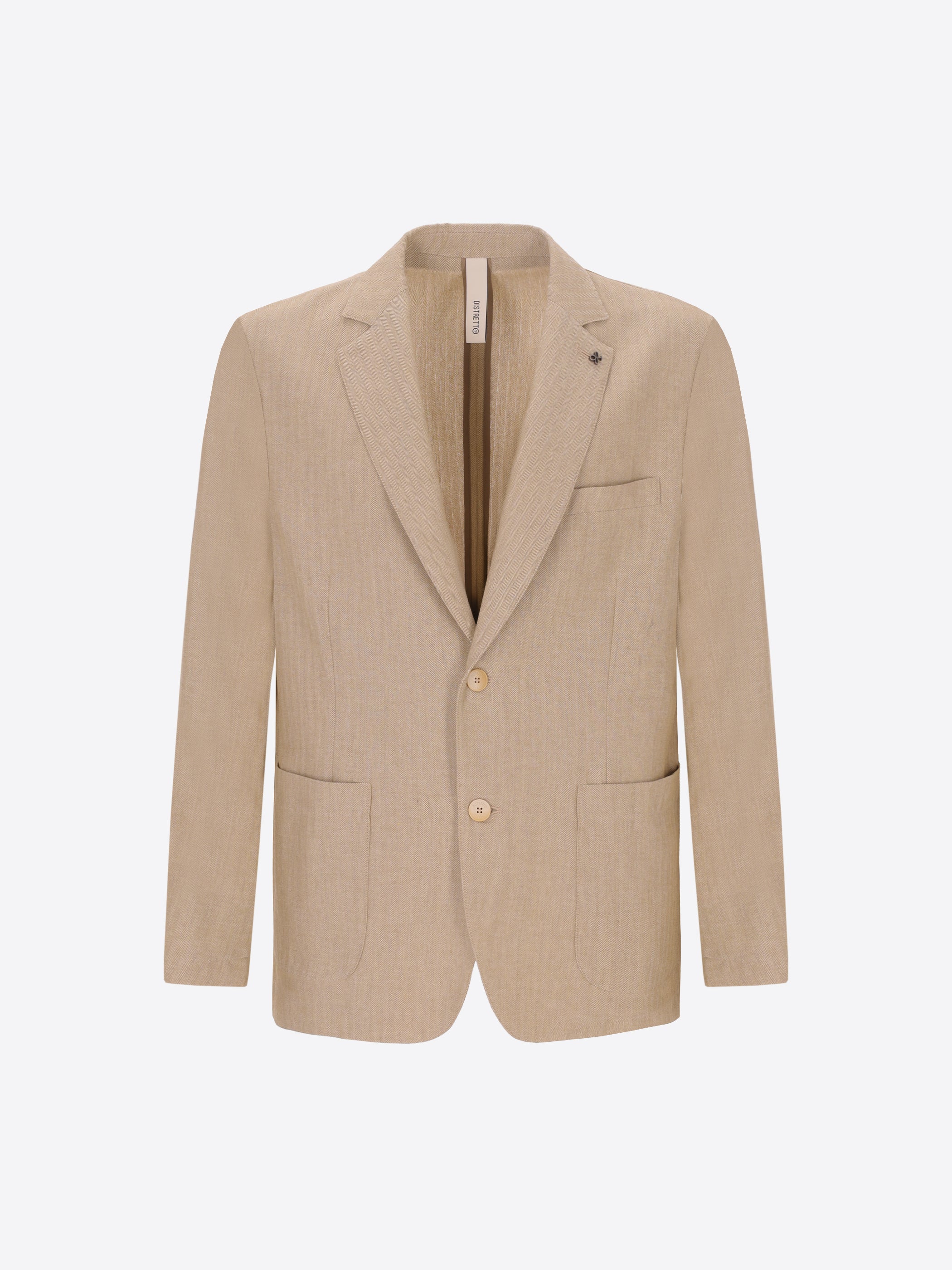 Single-breasted jacket crafted in lightweight and extremely fresh fabric with herringbone weave, featuring a two-button front closure, front patch pockets and a high welt chest pocket. The interior is fully unlined with cotton bias binding and a contrast inner pocket.