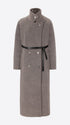 Overcoat in super comfort wool blend fabric. The garment features an asymmetric double-breasted opening with 5 buttons, two welt pockets, and a semi-lined body with contrast edges. High collar with button, can be worn open.