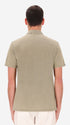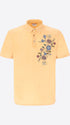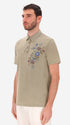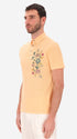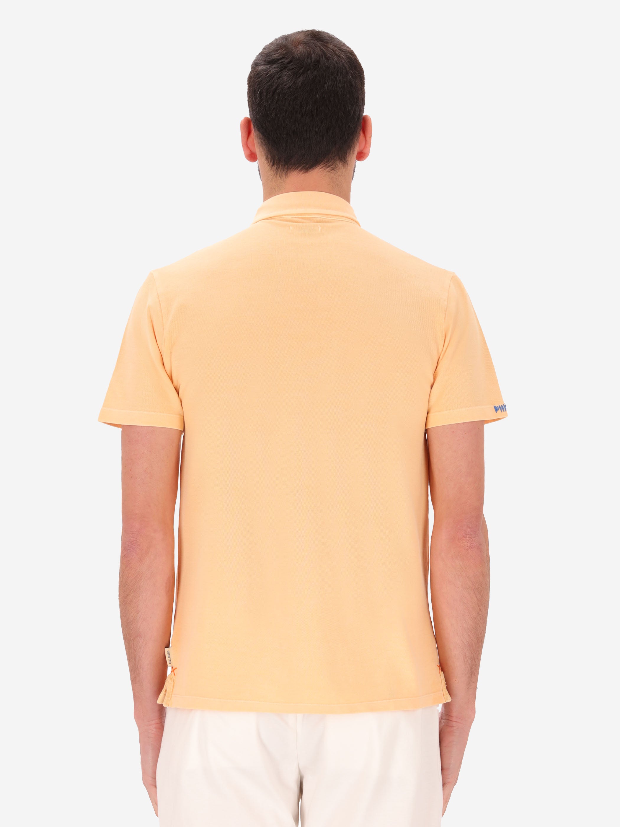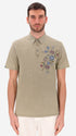 Short-sleeved polo shirt in piqué fabric with spread collar. Marbled wash with hand-made effect embroidery and ‘ramage’ print on chest. Polo fastening with buttonholes and buttons in different materials.