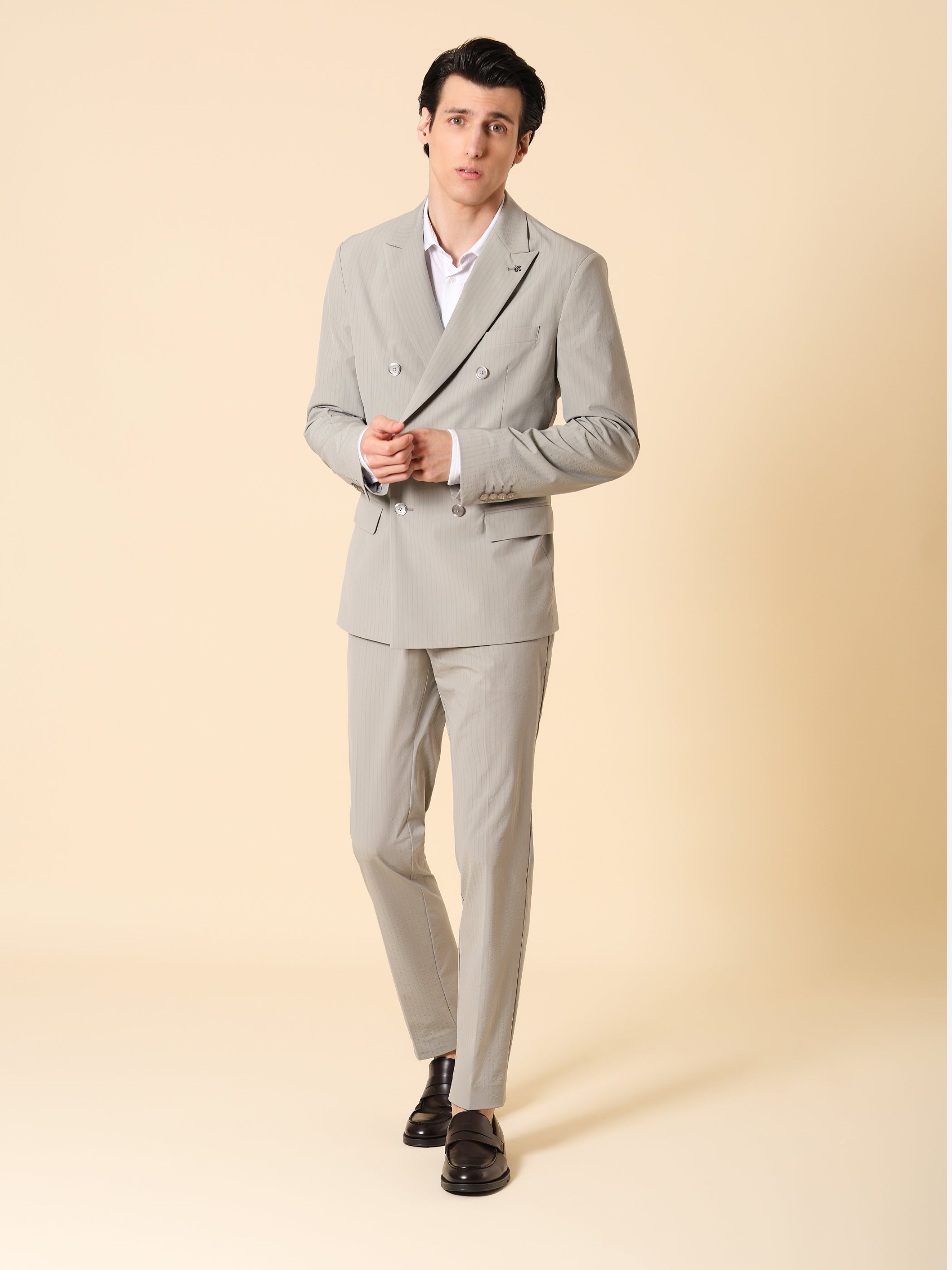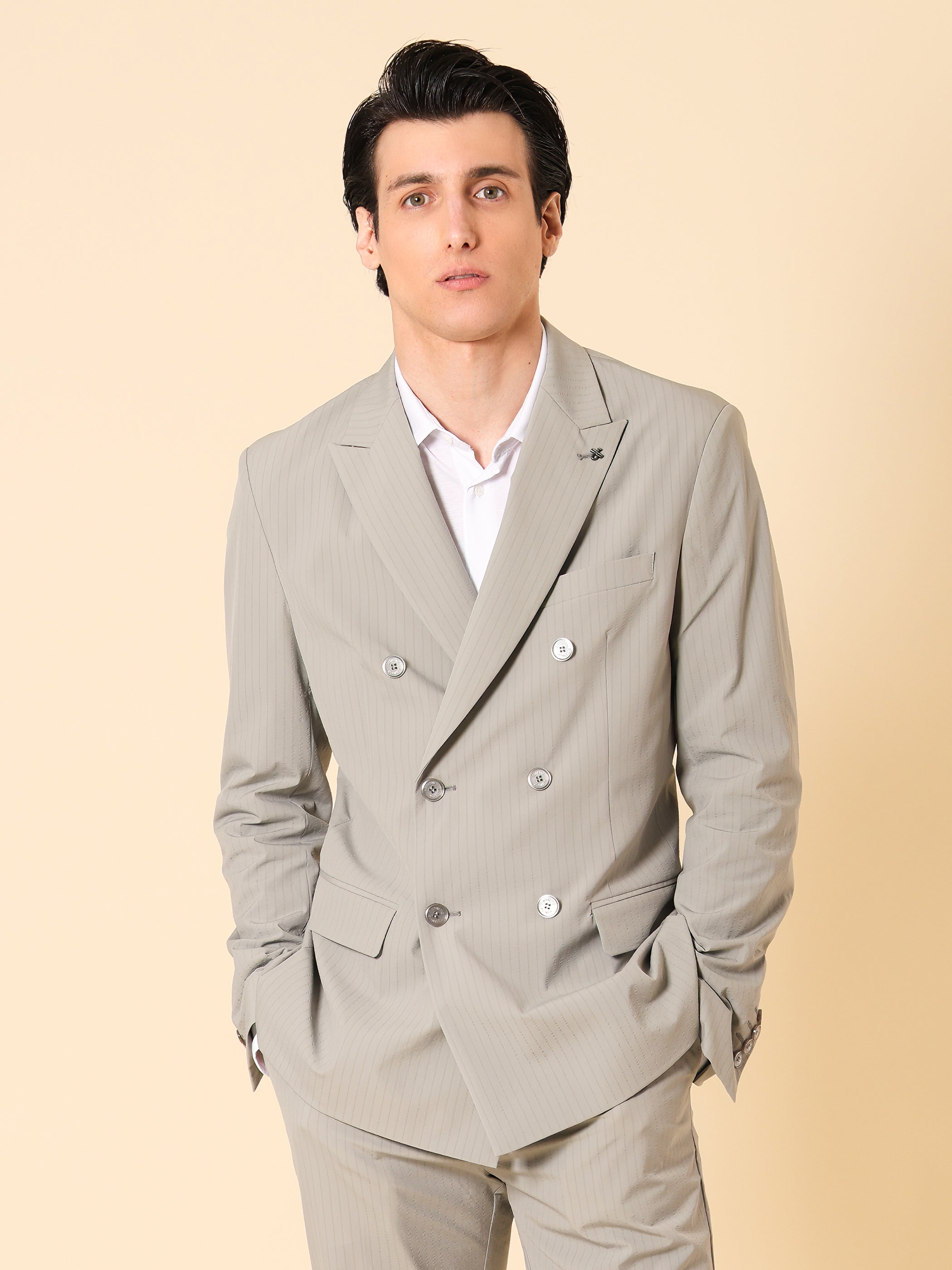 Semi-tailored double-breasted jacket in striped super-comfort fabric. The design features a two-button double-breasted front with peak lapels, welt pockets with flap and a welt chest pocket. The cuffs are finished with three buttons. Inside, it has a matching half lining with contrast AMF stitching.