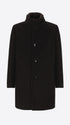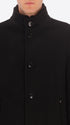 Coat in super-comfort wool-blend cloth with crater collar. The garment features welt pockets, a front opening with buttonholes and buttons, an unlined body with contrast binding, lined sleeves, an internal Punto Milano pocket and contrast binding on the inside. It is completed by a detachable chest insert with high crater collar lined in teddy-effect faux fur and detachable elastic logo braces, plus a single back vent.