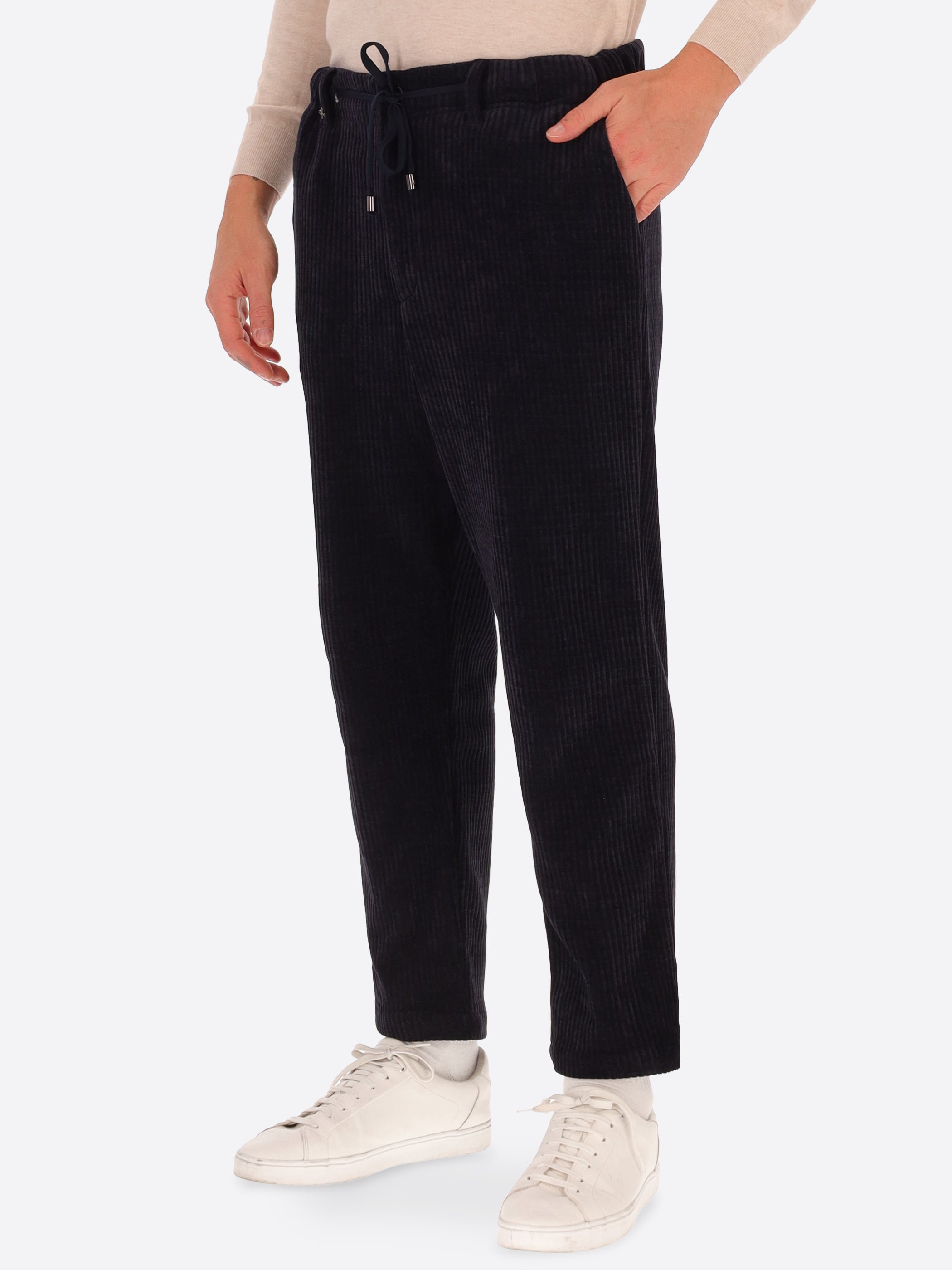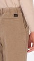 Pantalone dalla vestibilità relax in tessuto super comfort di velluto con costa alla francese. Il capo presenta un elastico in vita, apertura con zip e bottone, due tasche frontali alla francese, tasche a un fi letto sul dietro, sacchi tasca in fodera logata e una coulisse per la regolazione della vita.