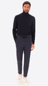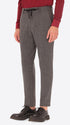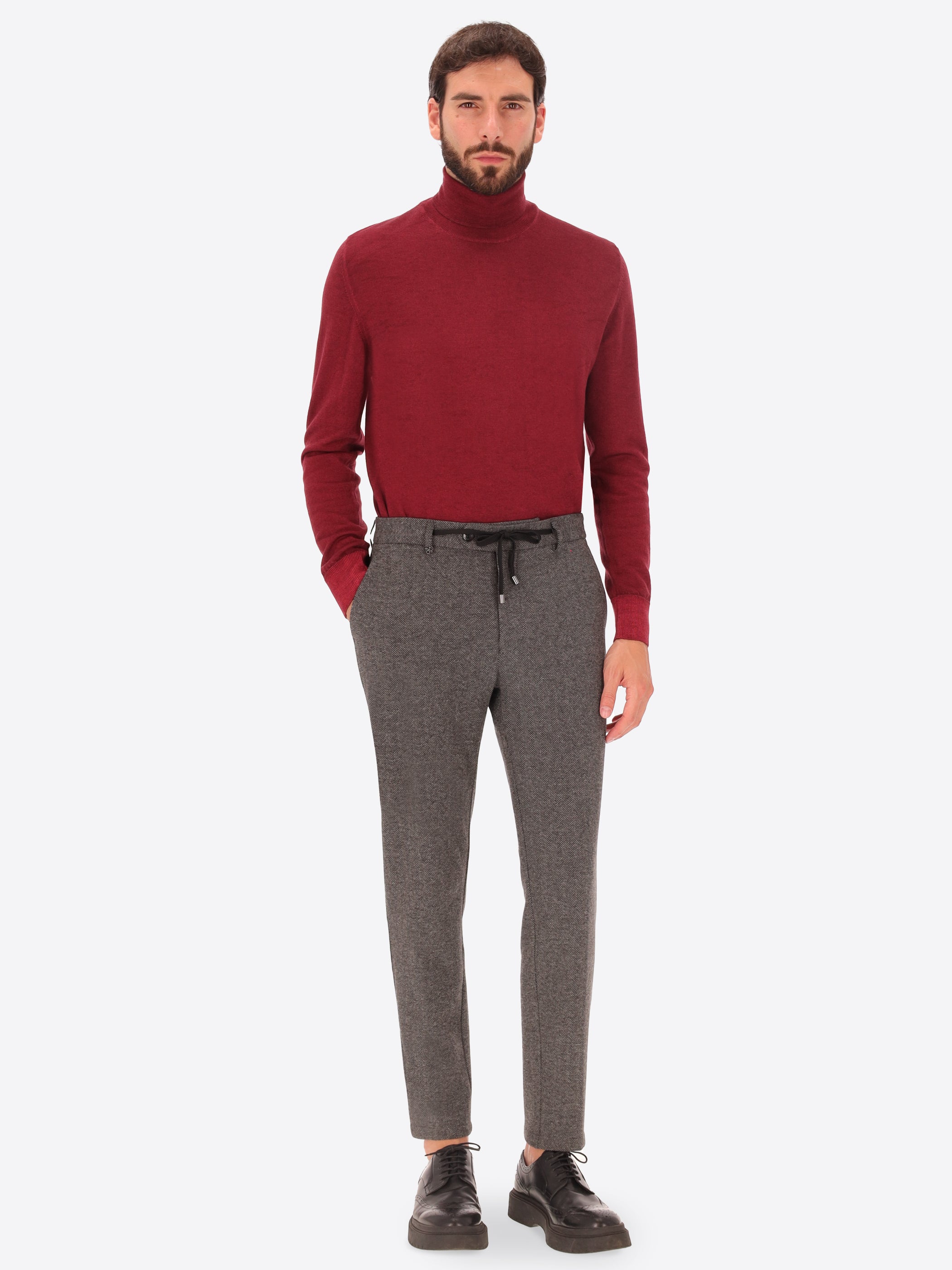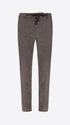 Pantalone regular fit in tessuto jersey super comfort mano calda dal disegno resca. Il capo presenta un’apertura con zip e bottoni, tasche frontali alla francese, tasche posteriori a fi letto ed una coulisse in vita con copri nodo in metallo. L’interno è caratterizzato da sacchi tasca in fodera logata.