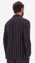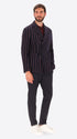Giacca in tessuto misto lana con disegno doppia riga. Il capo presenta un’apertura centrale a doppio petto con asole e bottoni, due tasche frontali a toppa, un taschino a pistagna sul petto, l’interno corpo sfoderato con bordi a contrasto mentre le maniche sono foderate, una tasca interna in jersey tecnico punto Milano, con spacco nel centro dietro.