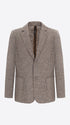 Giacca in tessuto misto lana con disegno falso unito melange. Il capo presenta un’apertura centrale con asole e bottoni, due tasche frontali a toppa, un taschino a pistagna sul petto, l’interno corpo sfoderato con bordi a contrasto mentre le maniche sono foderate, una tasca interna in jersey tecnico punto Milano, e uno spacco nel centro dietro.