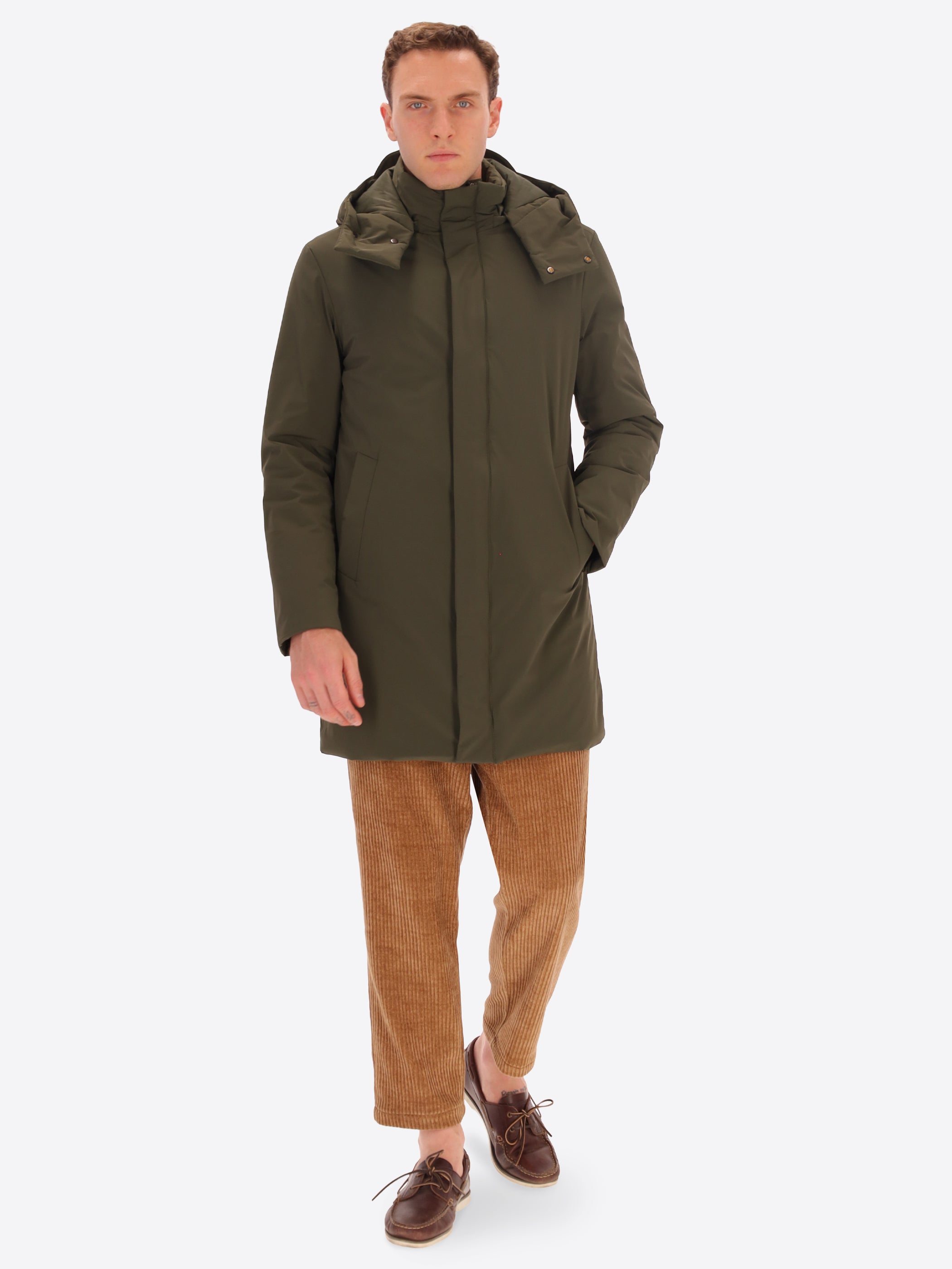 Piumino liscio in nylon stretch con cappuccio staccabile. Maniche lunghe, chiusura frontale con zip e bottoni a pressione, tasche a filetto e vestibilità regolare per il massimo comfort nelle giornate fredde.