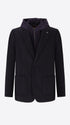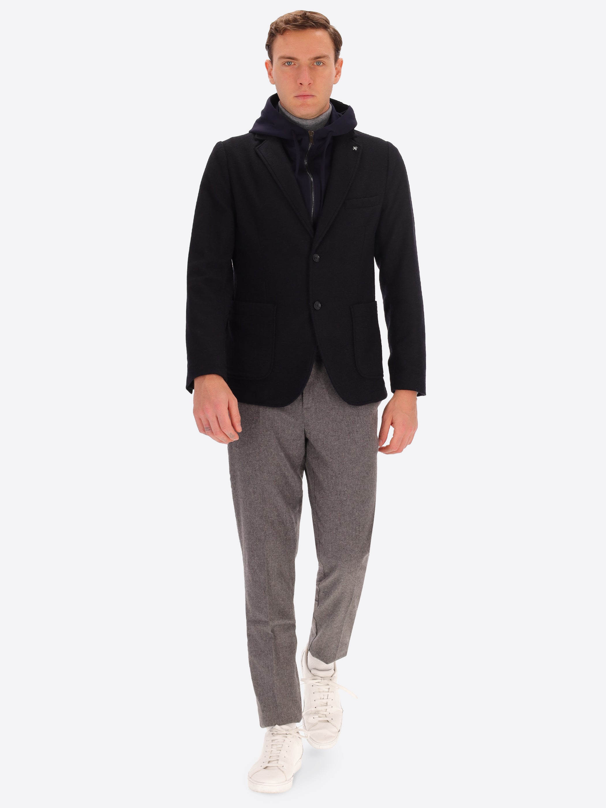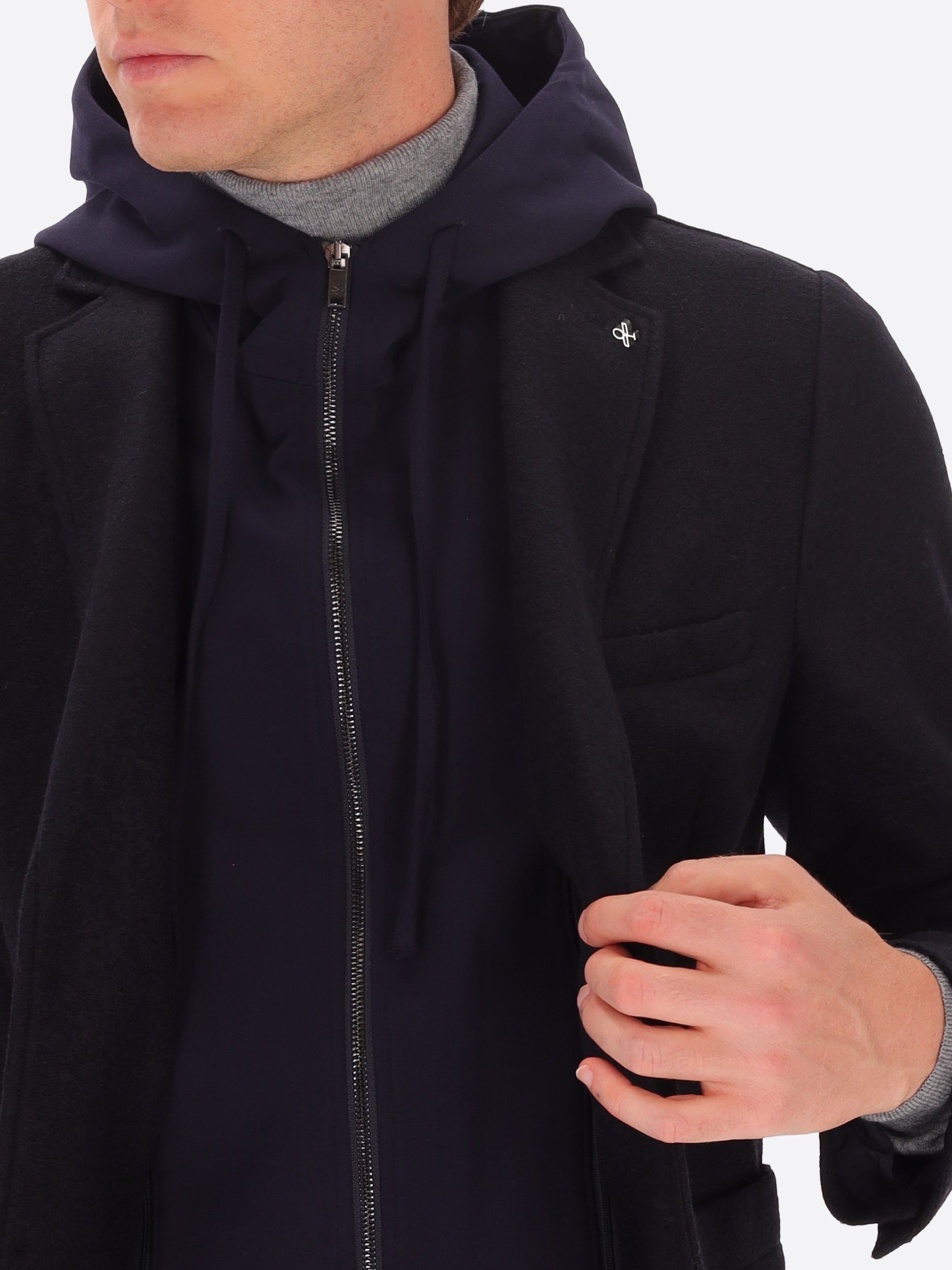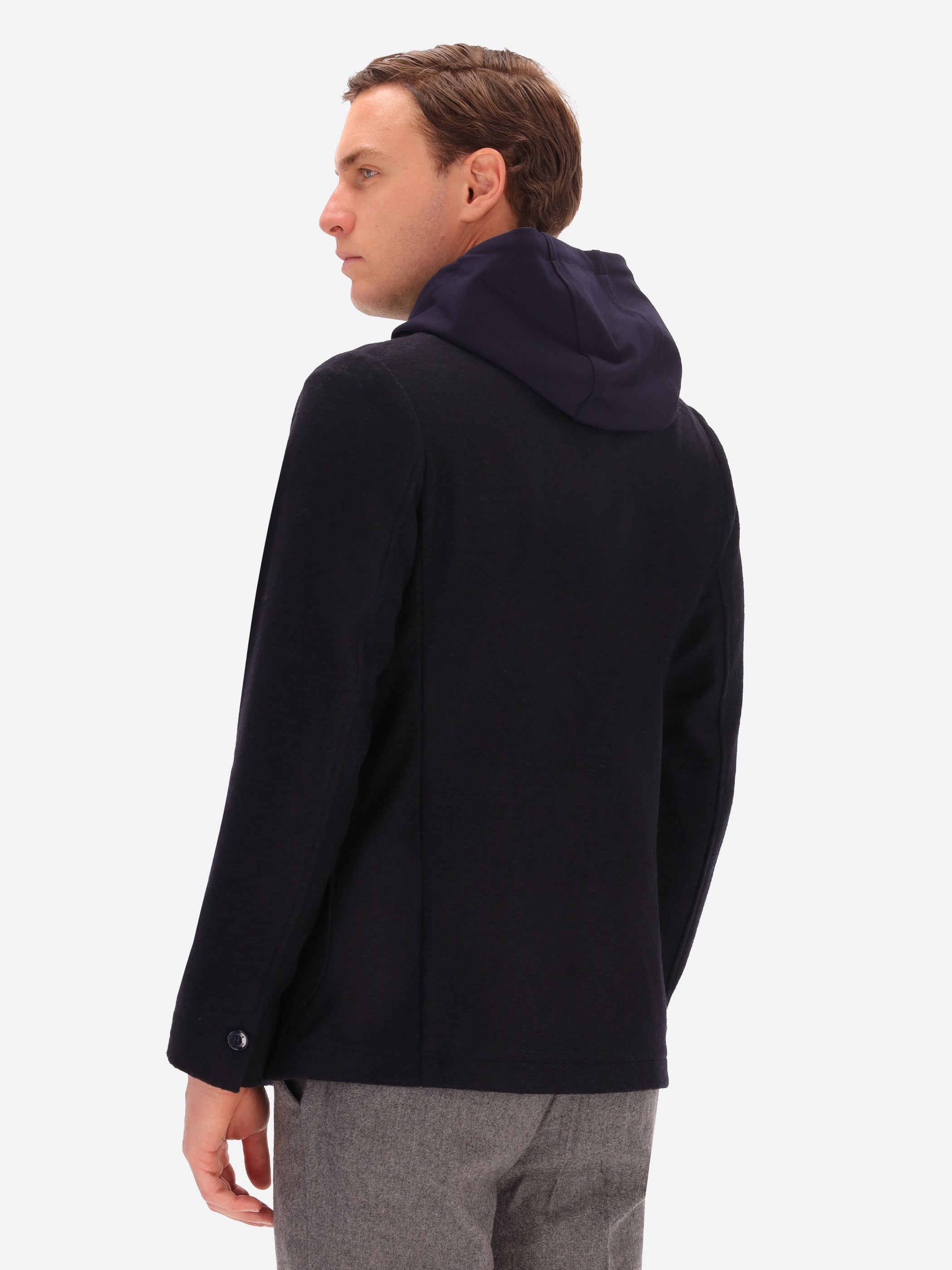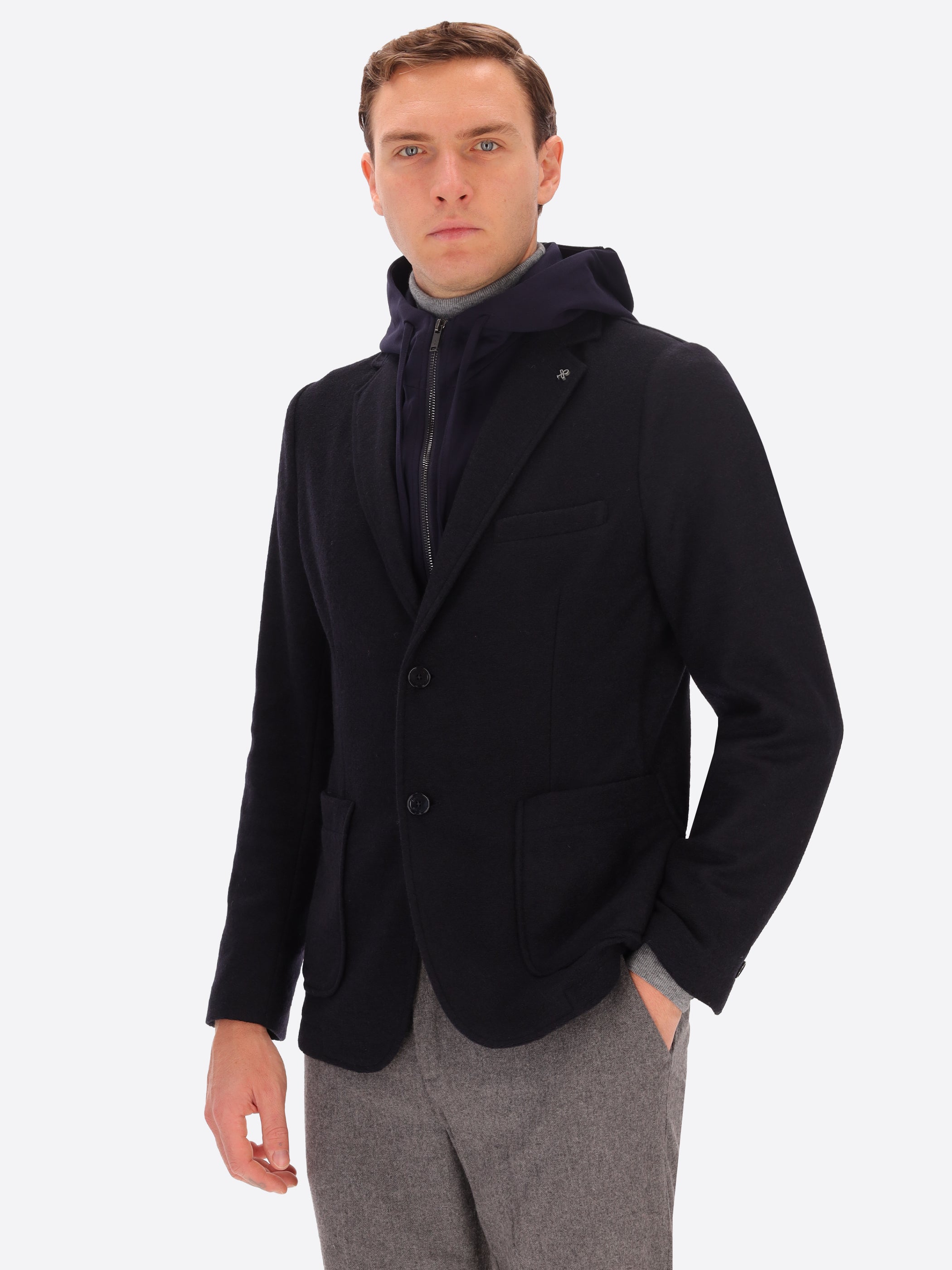Giacca in tessuto misto lana tinta unita/melange. Il capo presenta una pettorina con cappuccio staccabile in tessuto jersey tecnico punto Milano con zip, un’apertura centrale con asole e bottoni, due tasche frontali a toppa, un taschino a pistagna sul petto, l’interno corpo sfoderato con bordi a contrasto mentre le maniche sono foderate, una tasca interna in jersey tecnico punto Milano.